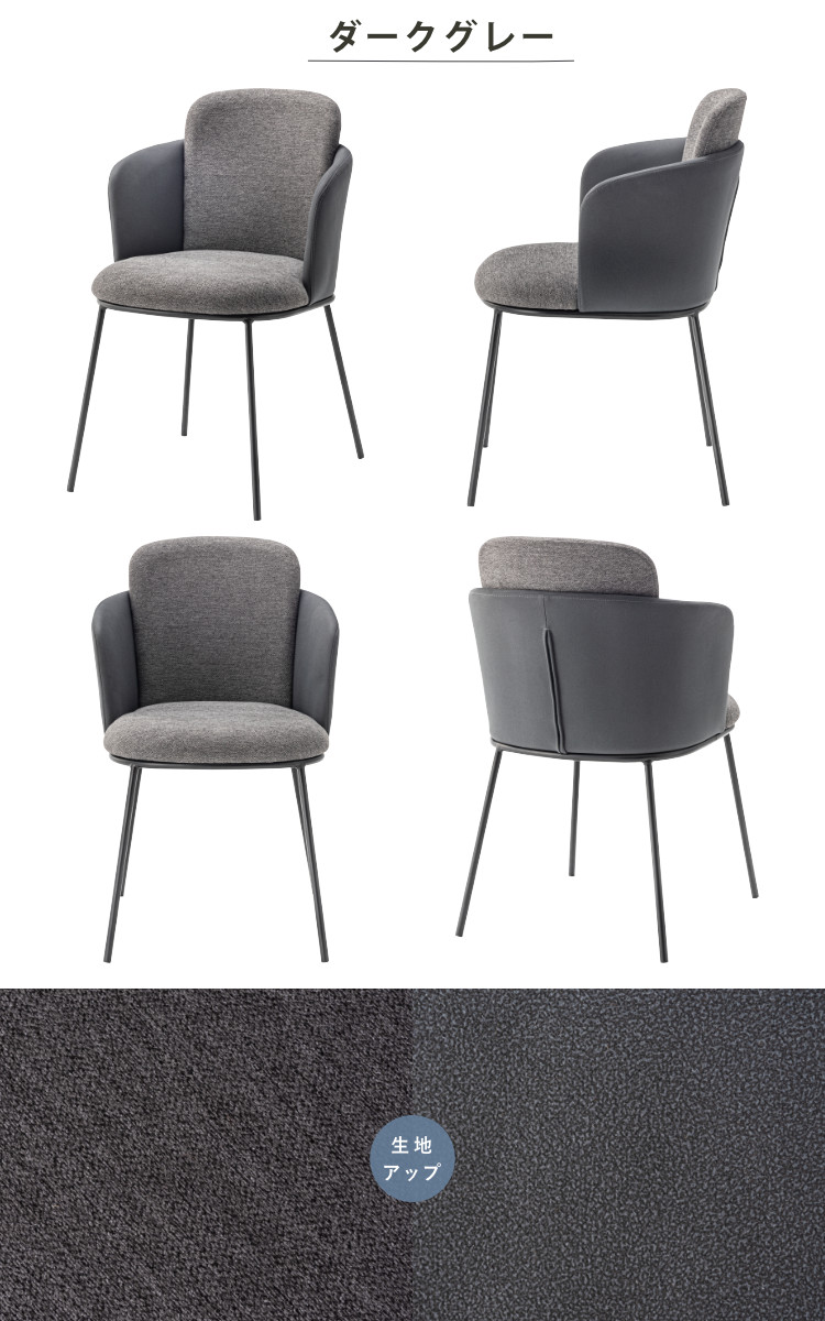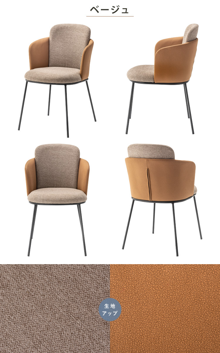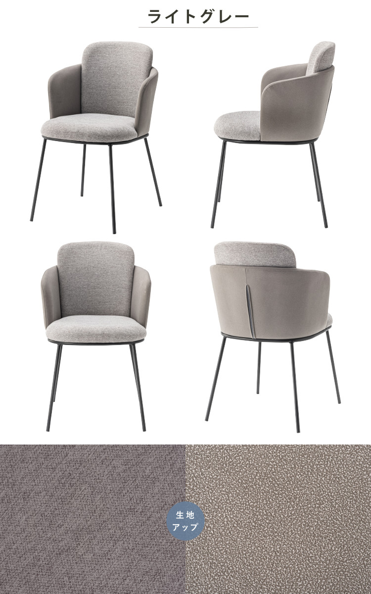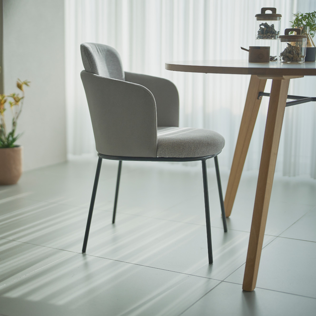 同系色の異なる質感のファブリックを使用し、シンプルに仕上げたダイニングチェアです。包み込まれるような座り心地で、長時間の食事や団らんのひとときも心地よく過ごせます。
