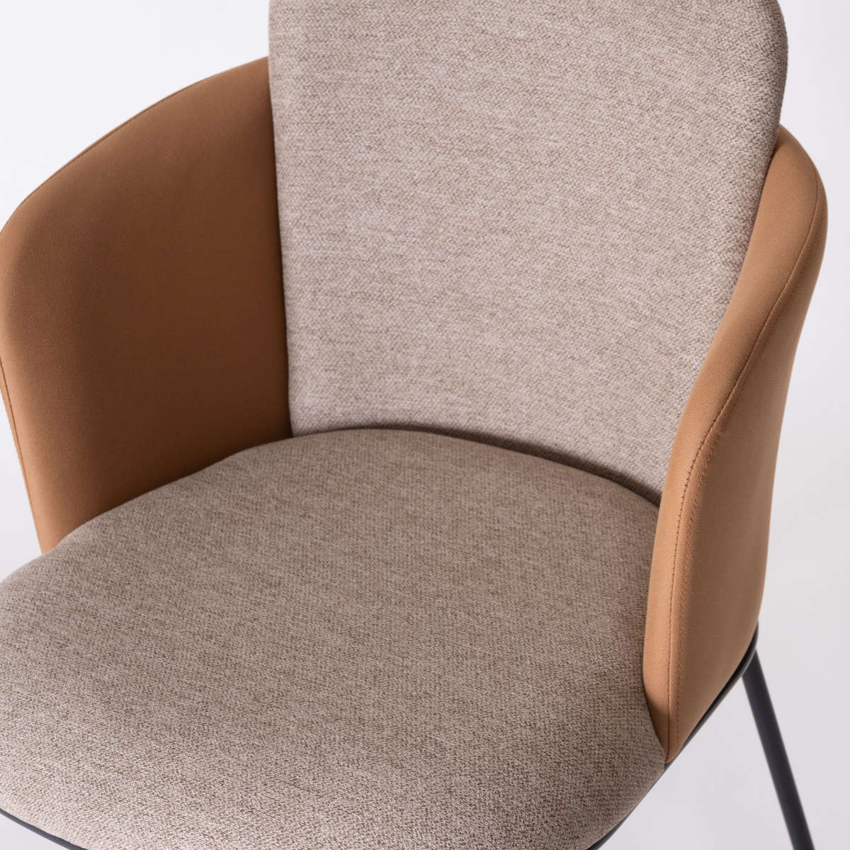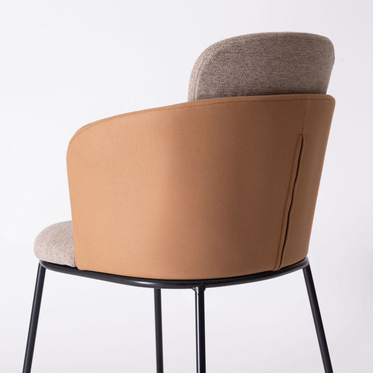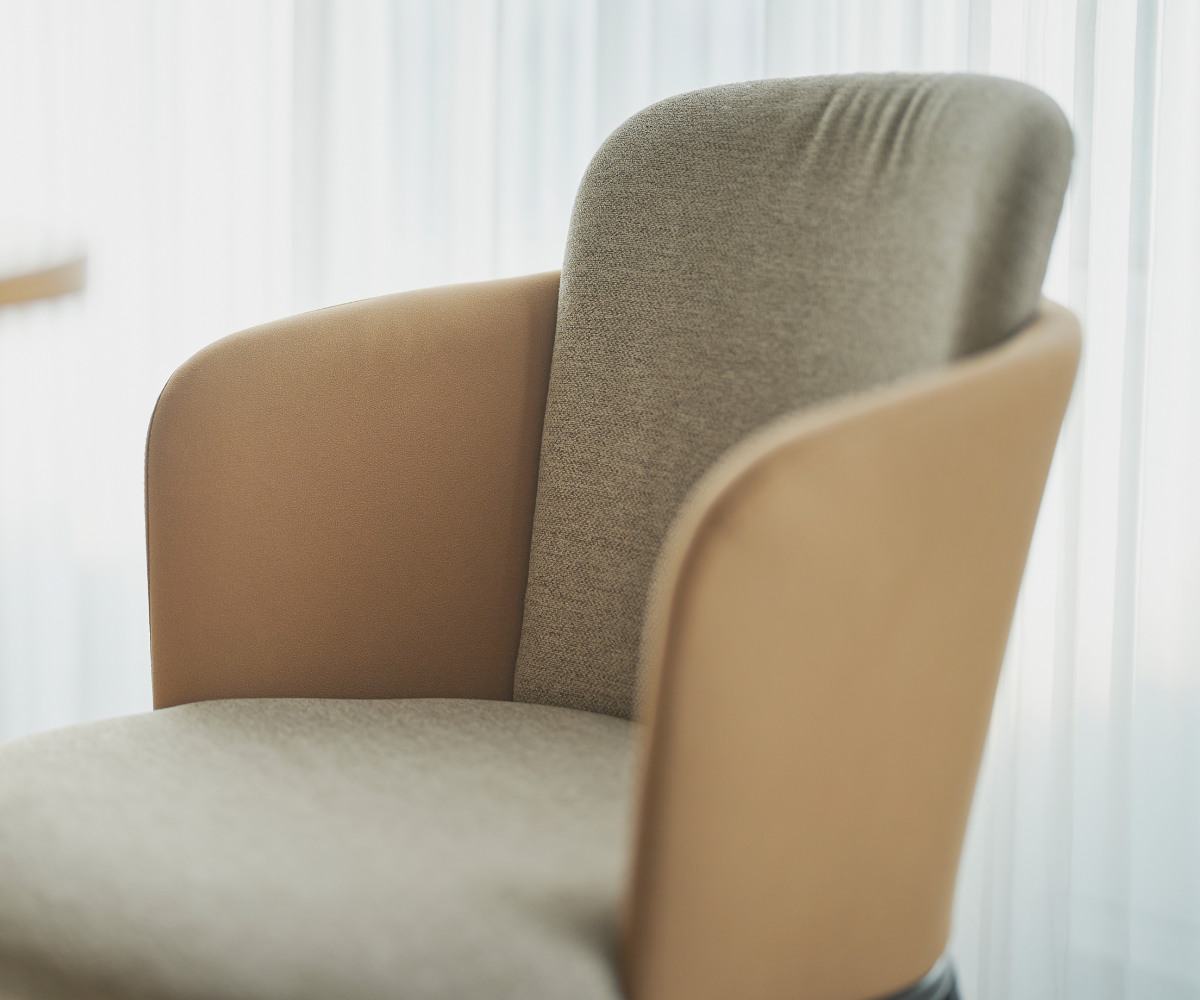 同系色の異なる質感のファブリックを使用し、シンプルに仕上げたダイニングチェアです。包み込まれるような座り心地で、長時間の食事や団らんのひとときも心地よく過ごせます。