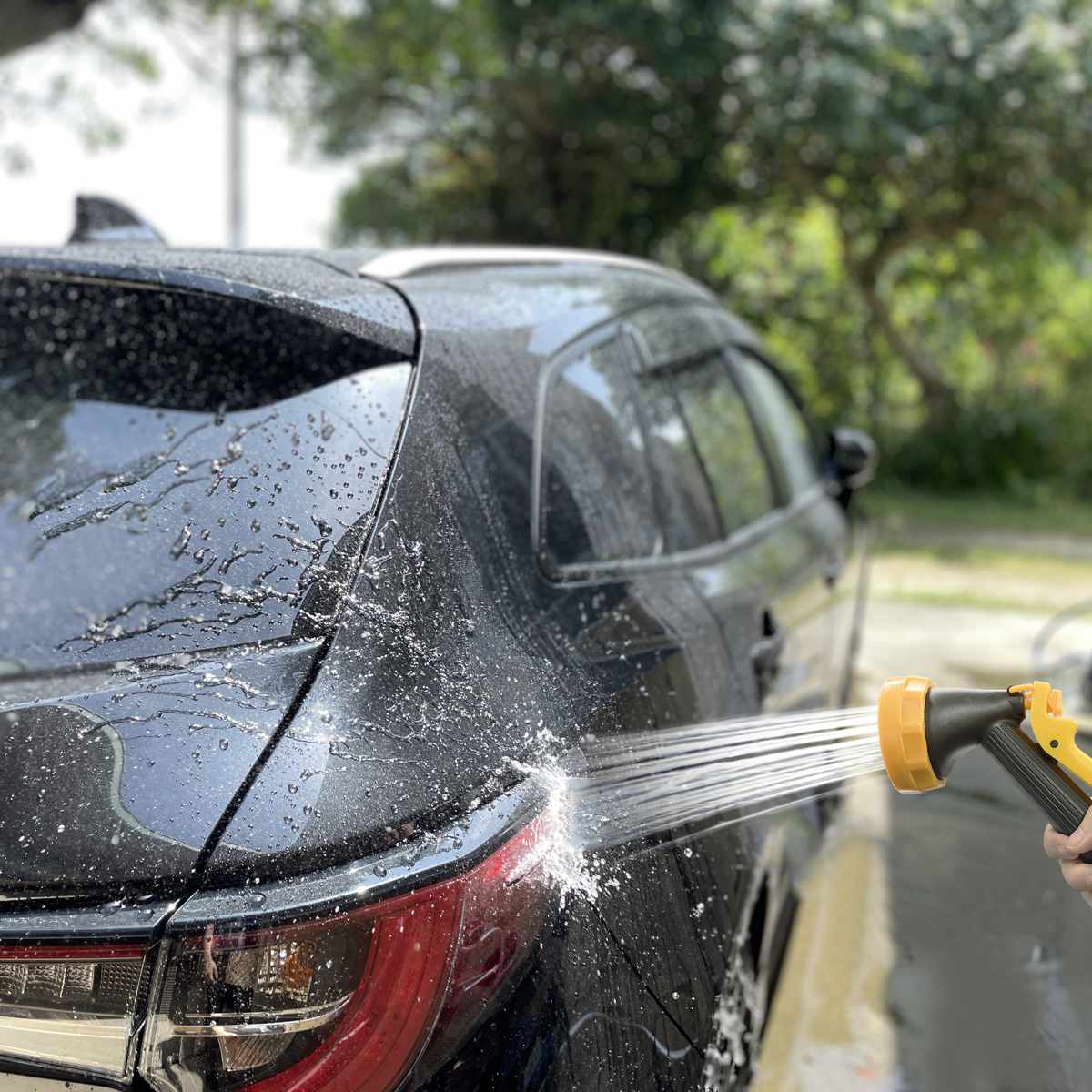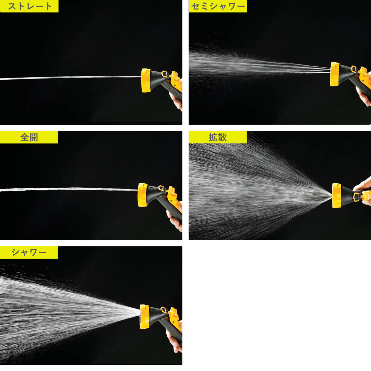 シャワーヘッドは5種類の水形から選べるため、汚れの状態や場所に合わせて使い分けできます。手元のレバーで簡単にON・OFFできるほか、レバーをロックすれば連続散水も可能です。最大7リットルまで水を入れられるので、たっぷり使えて安心です。