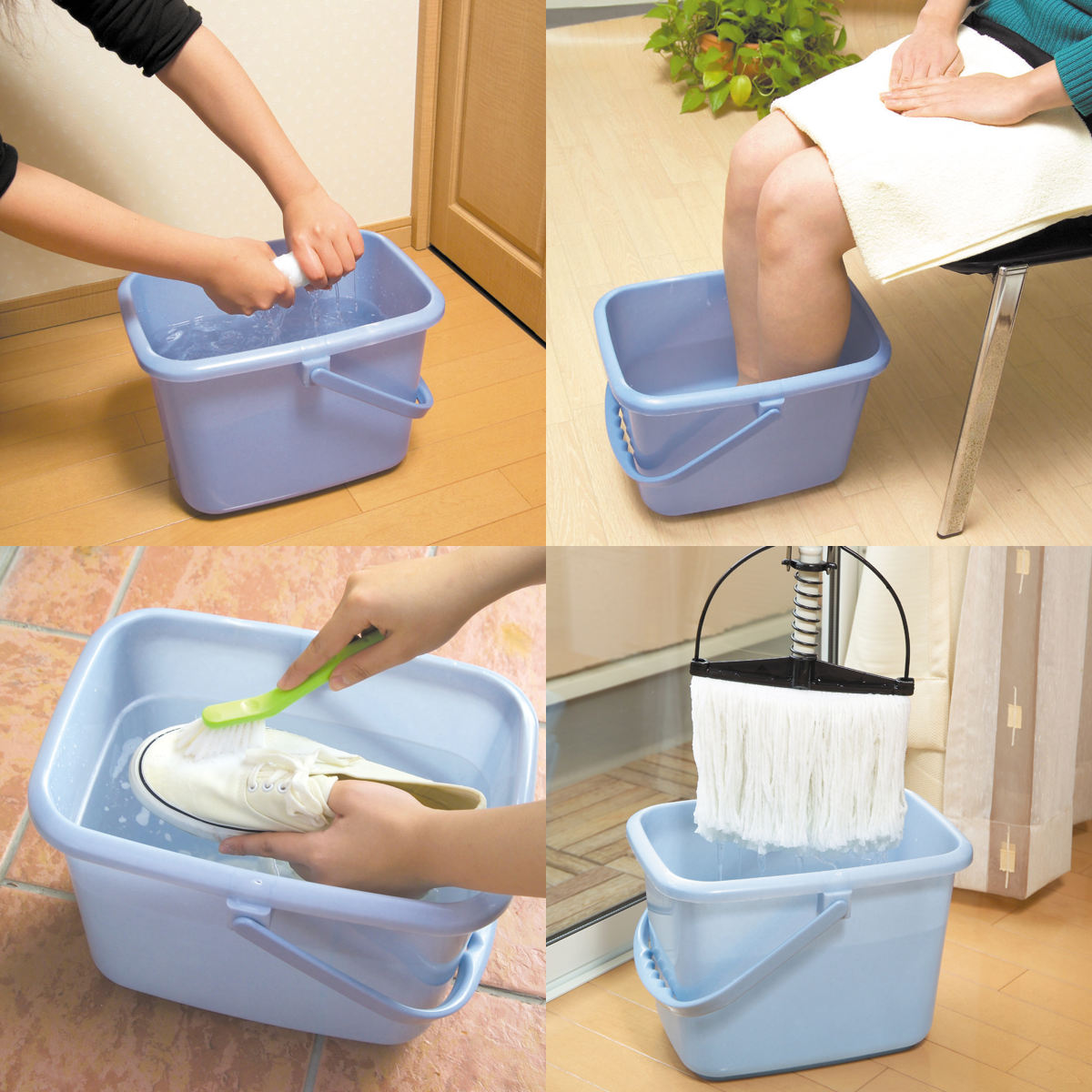 足湯やモップ洗いに最適な角型バケツです。収納の際にデットスペースをつくらず、場所も取りません。