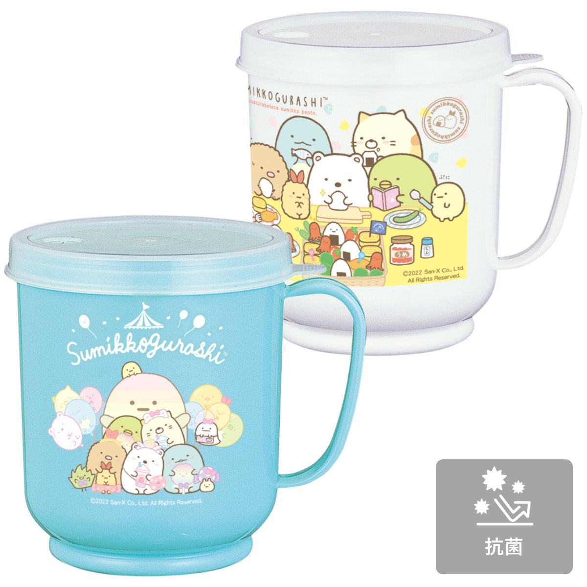 すみっコぐらしの抗菌加工が施されたプラコップです。フタ付きでホコリの侵入を防いでくれるので、衛生的に飲み物が飲めます。こぼれにくく、小さなお子様が飲む時や、介護、看病の際にも便利なコップです。
