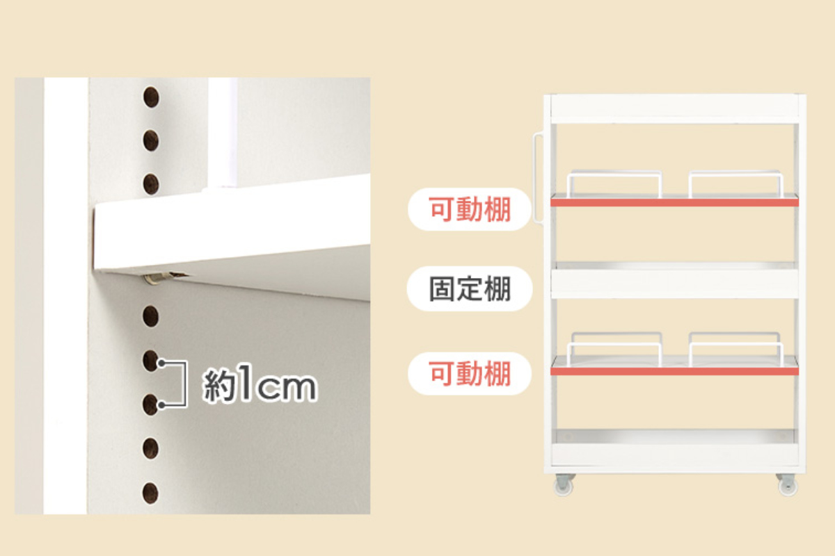 収納するアイテムに合わせて、1cmごとに高さ調節が可能なので、自由度の高い収納が叶います。
