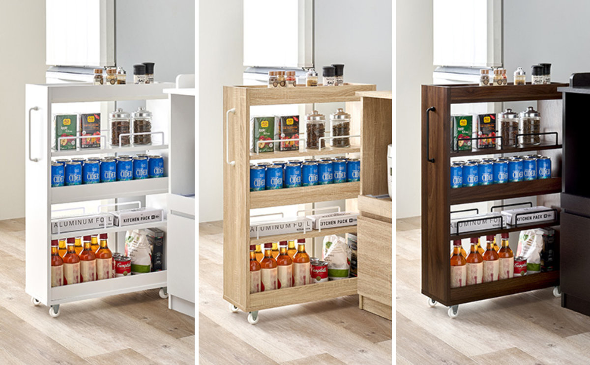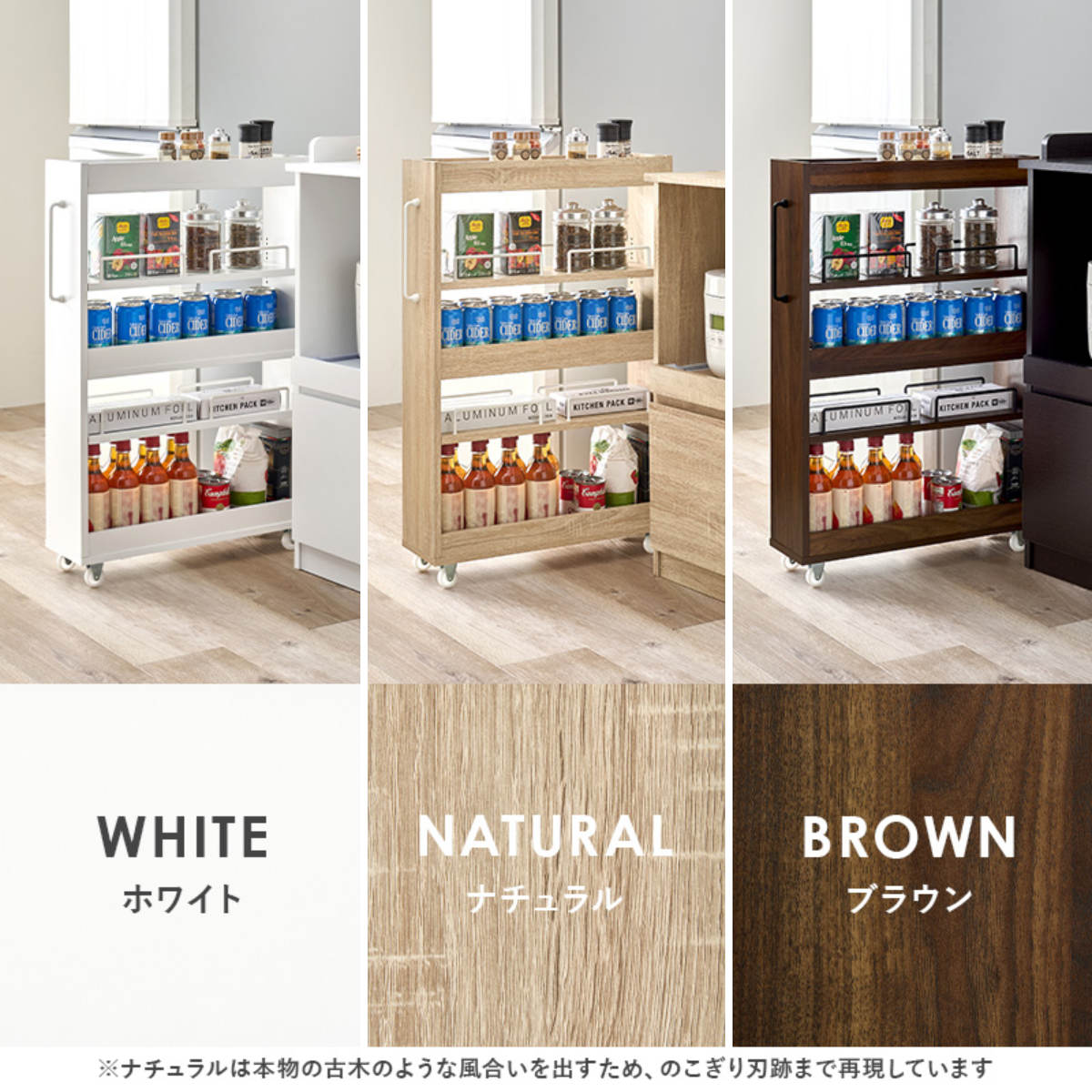 隙間収納ワゴンには珍しいプリント紙化粧パーティクルボード製で、木目調のものもあります。キャビネットやシンク扉の色に合わせるとキッチンのインテリアにも自然と溶け込み、生活感を感じさせません。