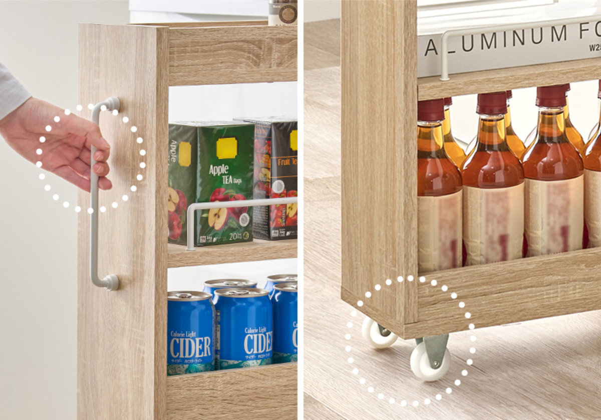 握りやすい大きめの取っ手とスムーズに動くキャスターが付いているので、必要な時にサッと引き出して使え、使わない時は隙間にスマートに収納できます。お掃除の際の移動もラクです。