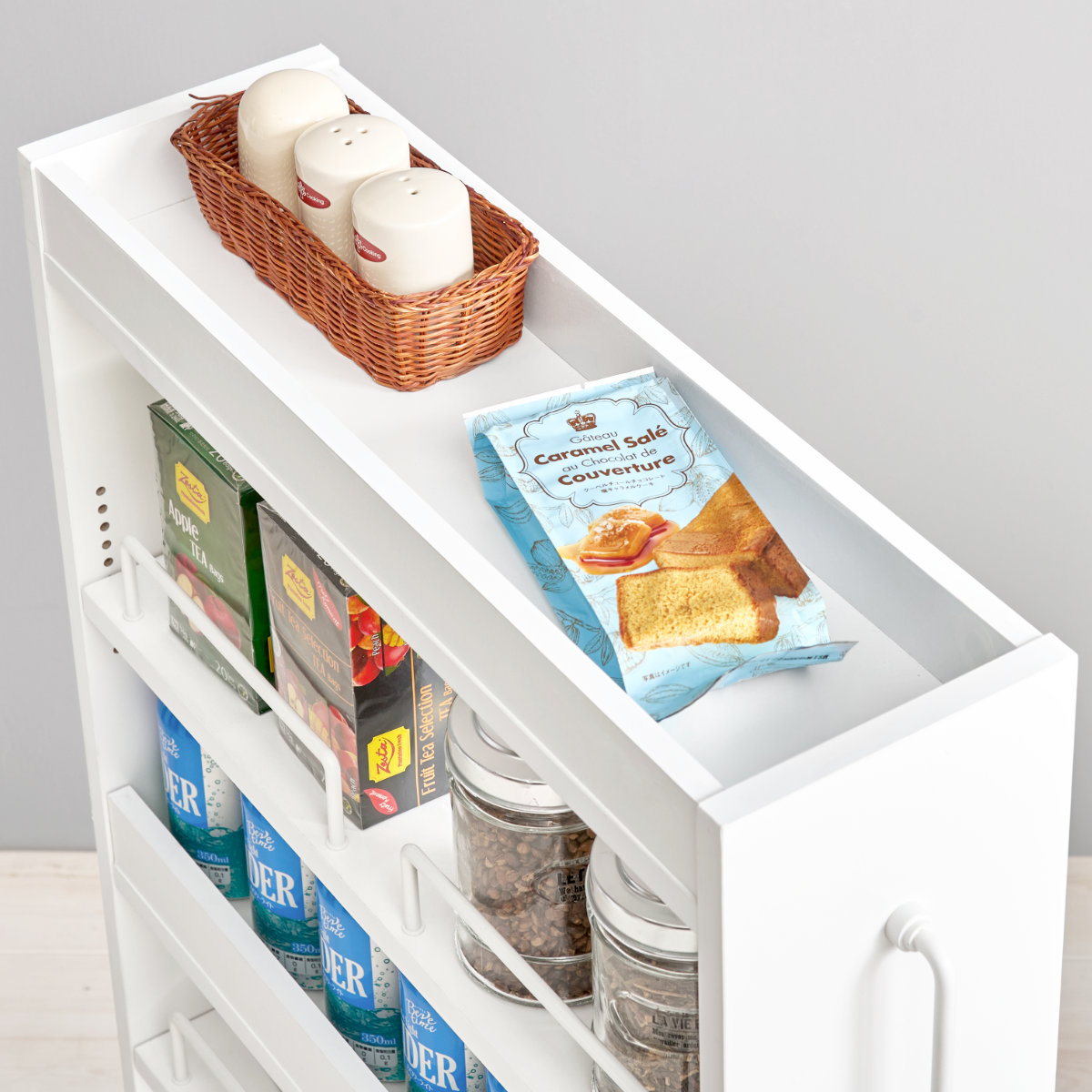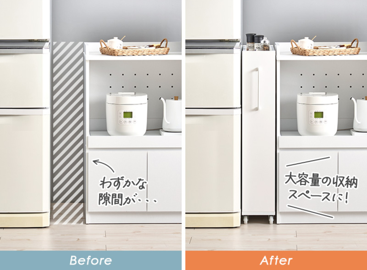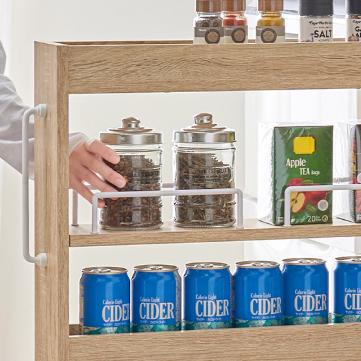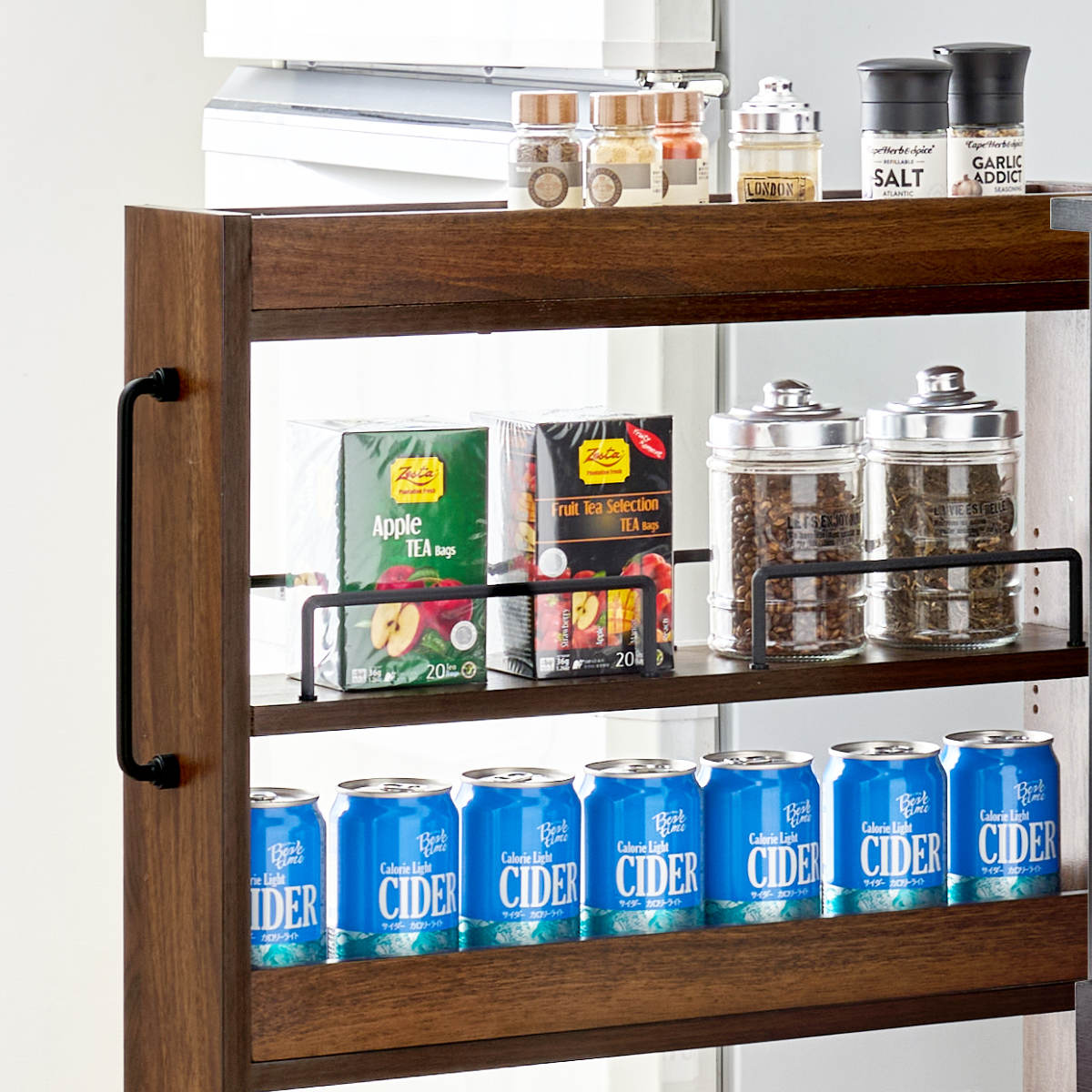 「キッチンに物があふれていて、もっとスッキリさせたい」「食品のストック場所が足りない」そんなお悩みを解消する隙間収納ワゴンです。キャビネットと冷蔵庫の間、シンクと冷蔵庫の間など、今までデッドスペースだった隙間を有効活用でき、ごちゃつく小物や食品ストックをスッキリと収納します。
