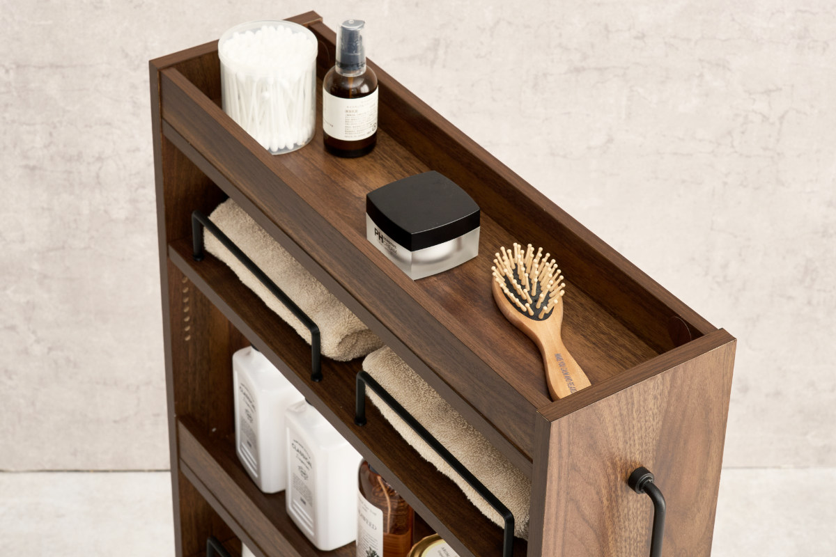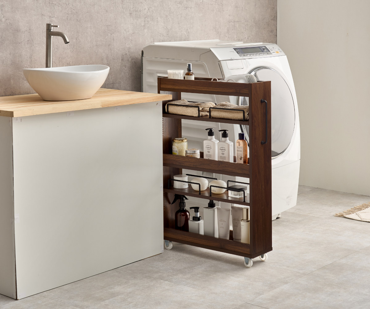 キッチンはもちろんのこと、さまざまな場所に設置できます。洗面所では洗濯機と洗面台の間で、洗剤や化粧品、タオルなどの収納に使えます。また、トイレやリビングでは壁面に沿わせて収納ラック・ディスプレイラックとして置くこともできます。