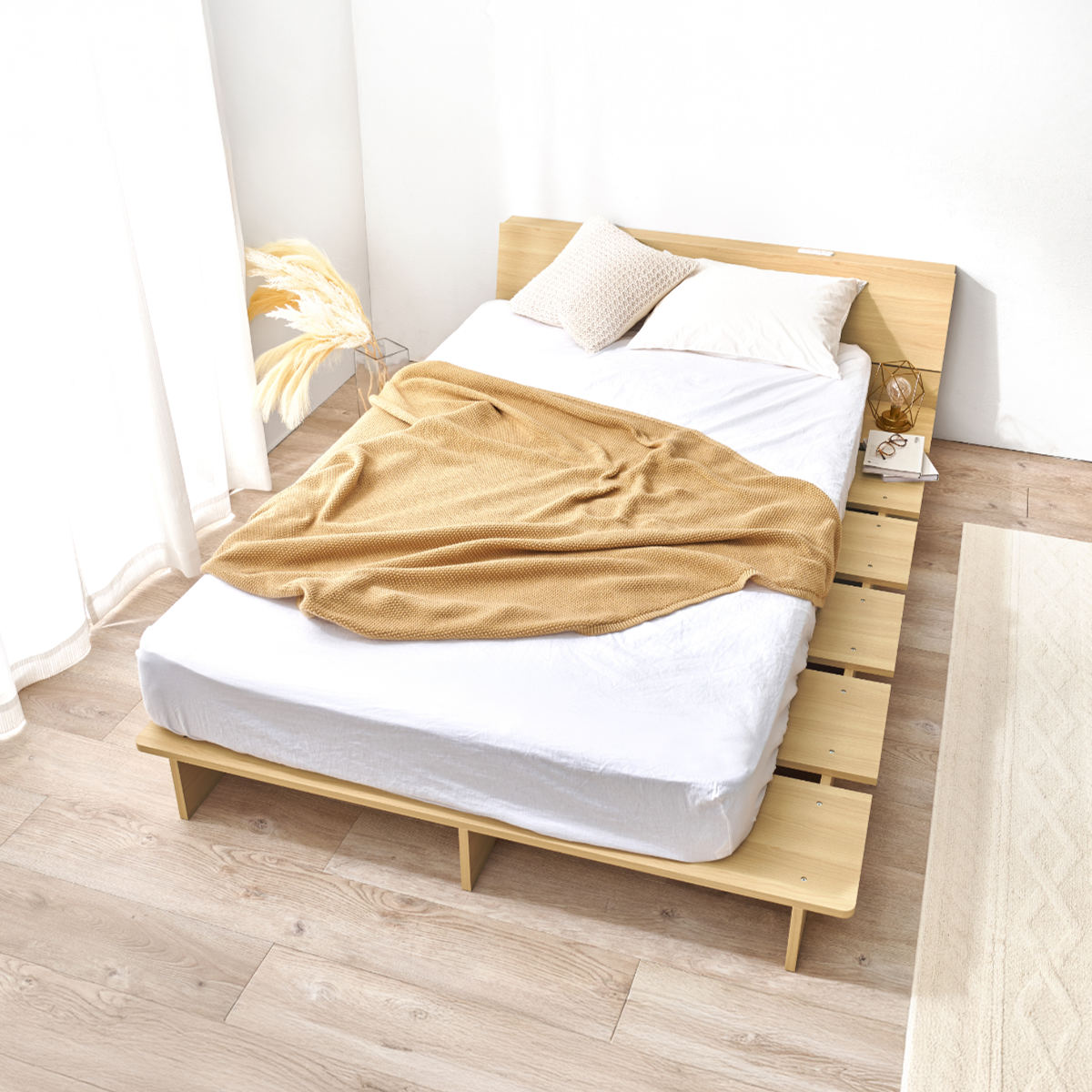 フレームよりも小さいサイズのマットレスと合わせると、余白が生まれお洒落な雰囲気になるローベッドです。サイドに小物などを置けるステージベッドとしてお使いいただけます。一般的なベッドよりも幅が広いので、ゆとりのあるベッドスタイルが実現します。