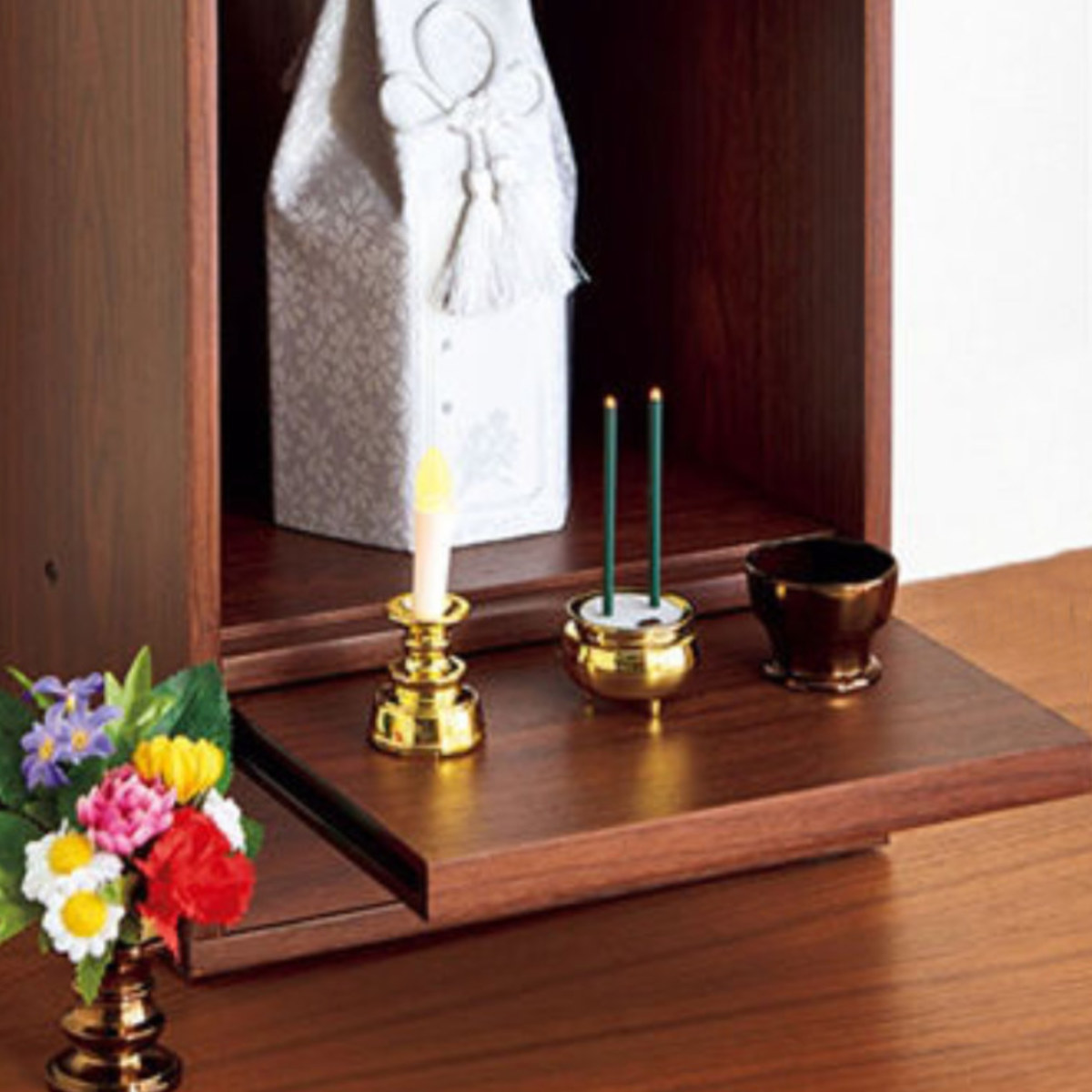 スライド式のテーブルを引き出せば、お花やお供え物を置くスペースとして使えます。
