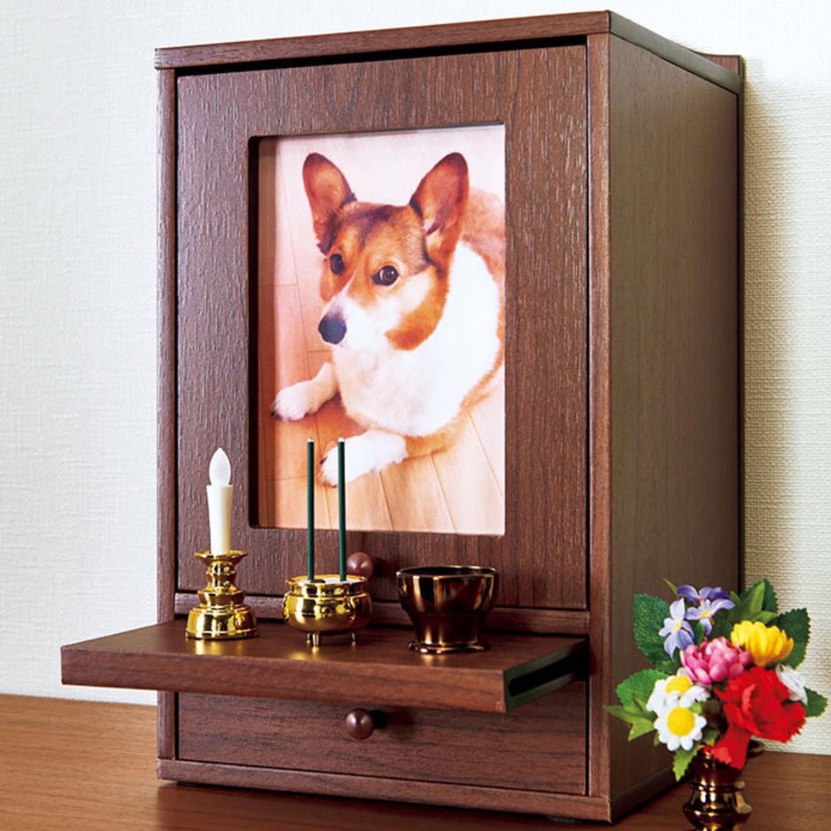 お線香などの仏具や、首輪、写真、手紙など、小さな思い出の品を保管できる引出しが付いています。