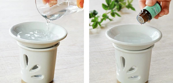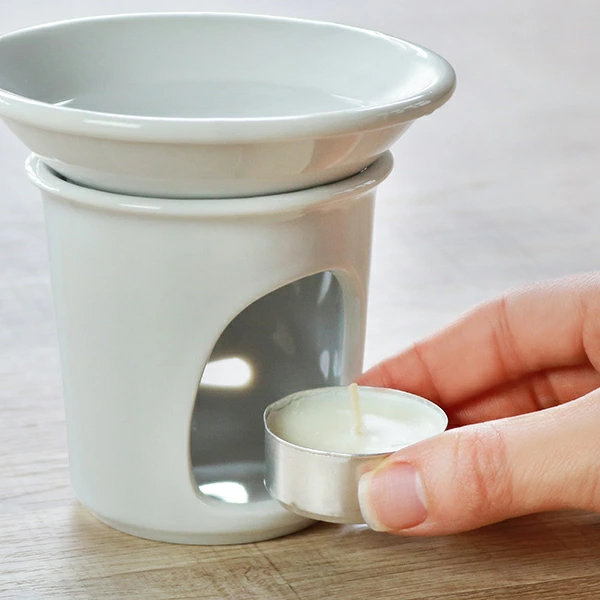 オイル皿に水を入れ、お好みのエッセンシャルオイルを1~5滴ほど垂らします。キャンドルをウォーマーにセットし、火を灯すと、徐々に水分が蒸発し、やさしい香りが広がります。