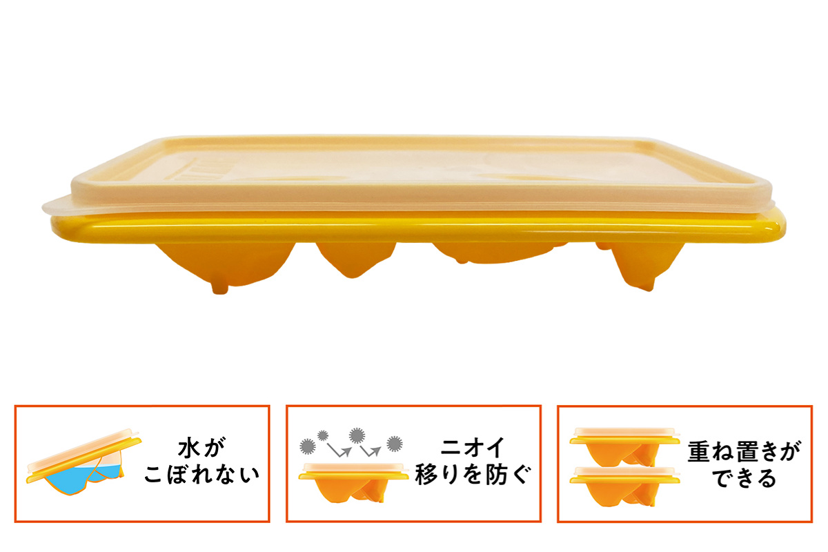 持ち運びや冷凍庫の開閉時に、水がこぼれない密閉性の高いフタ付きです。冷凍庫内で重ねて収納ができ、スペースを有効活用できます。