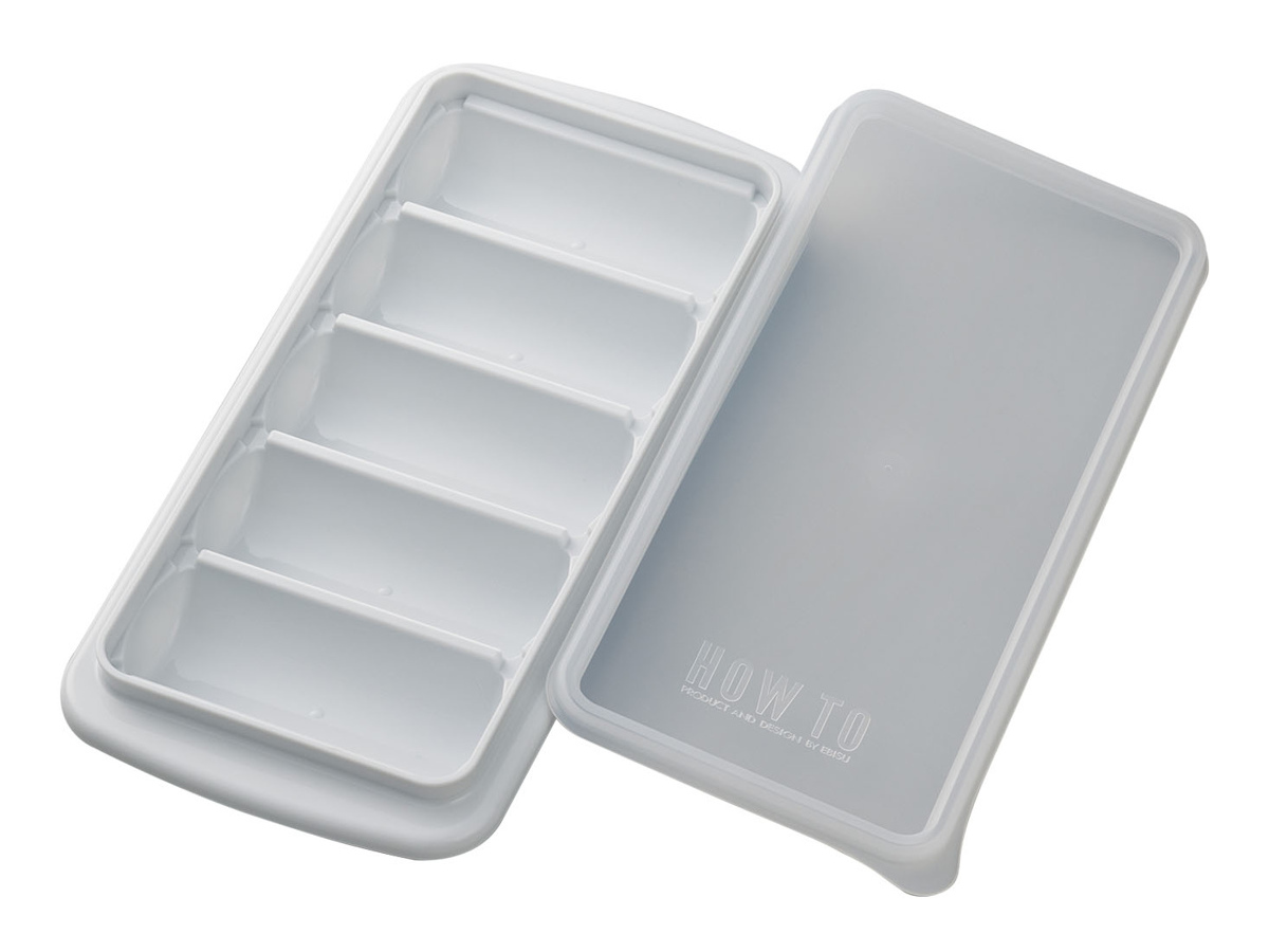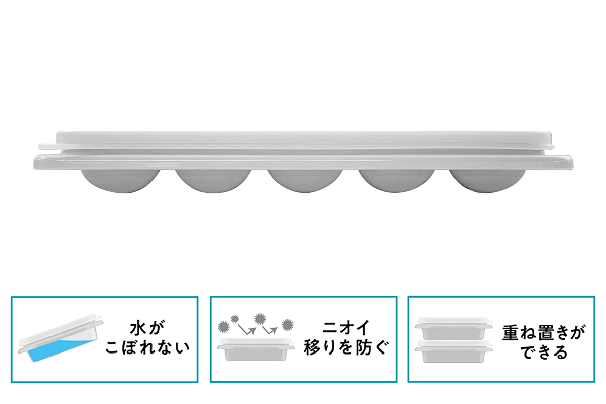 持ち運びや冷凍庫の開閉時に、水がこぼれない密閉性の高いフタ付きです。冷凍庫内で重ねて収納ができ、スペースを有効活用できます。