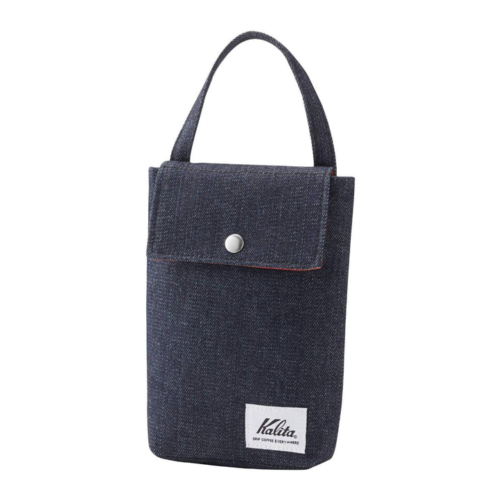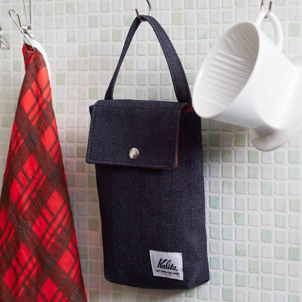 取っ手が付いているので、フックに掛けて壁面収納もOK。デニム調の外側に内側は赤いチェックがポイント。コーヒー道具と並べても◎。
