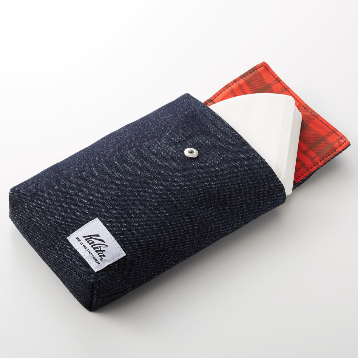 ●デニム調×赤いカリタチェックのフィルターバッグです。