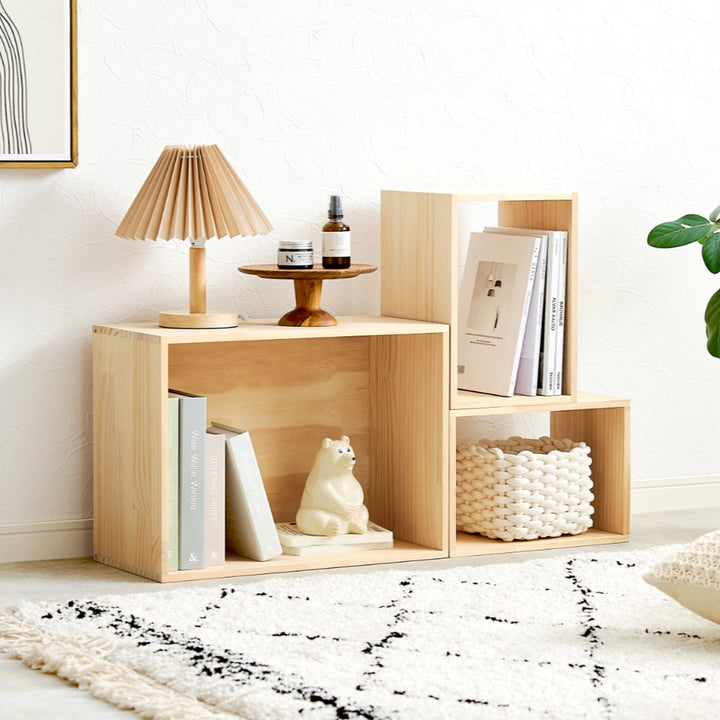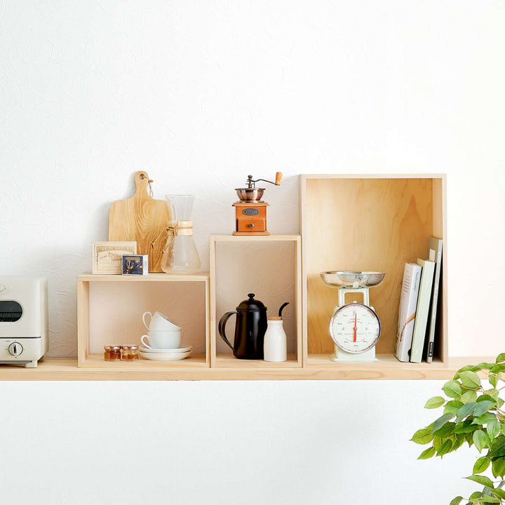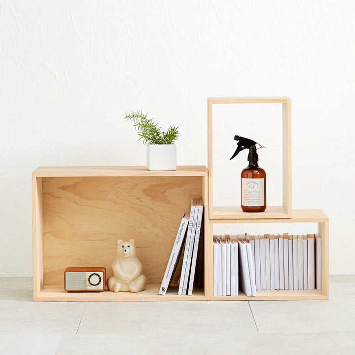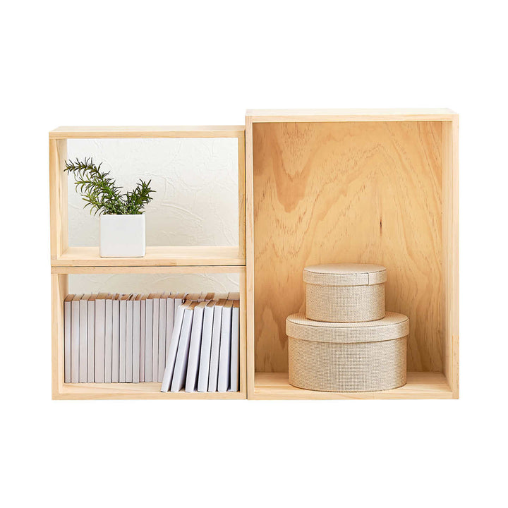 重ねたり並べたり、好きな組み合わせで使える収納ボックス3点(大/1個、小/2個)セットです。温かな木目が特長の天然木パイン材を使用しているので、経年による色味の変化をお楽しみいただけます。
