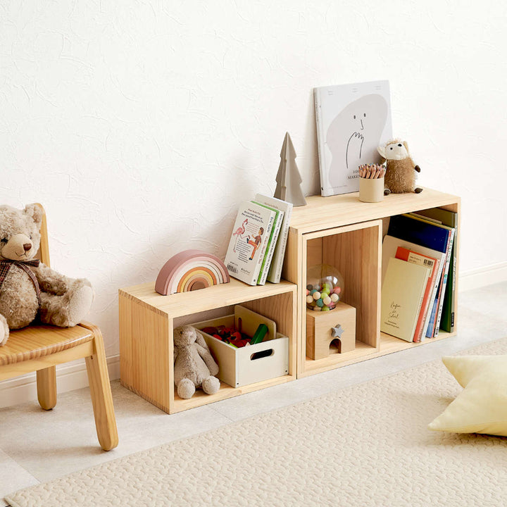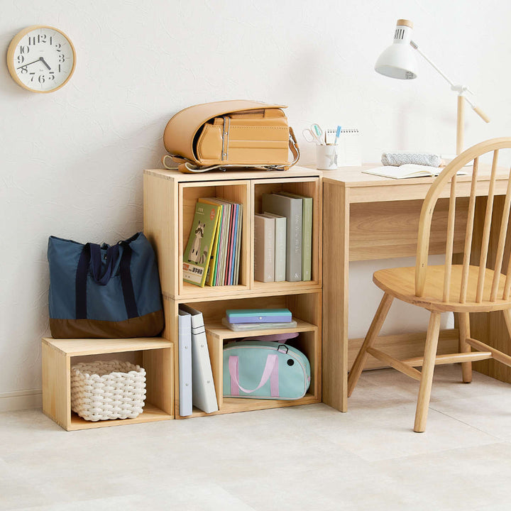 お子さまの成長に合わせた使い方ができます。お子さまが小さな時には、おもちゃや絵本を整理する棚として、小学生の時には教科書や嵩張る学用品を一か所にまとめて。学生や大人になってからは、ワークスペースや作業台の棚として、変化するライフスタイルに対応できます。