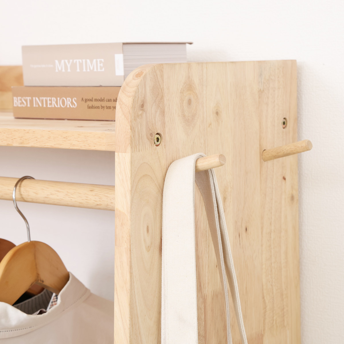 天然木の木目や節といった個性をそのまま活かしたデザインのハンガーラックです。掛け幅66cmでたっぷりと掛けられ、サッと取り出すことができます。高さは100cmと、お子様でも使いやすい高さでお部屋を圧迫しません。