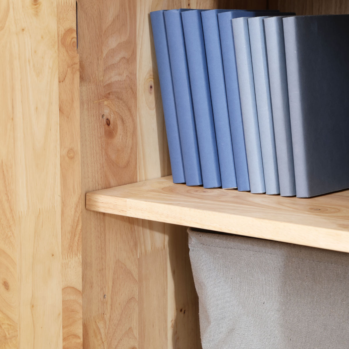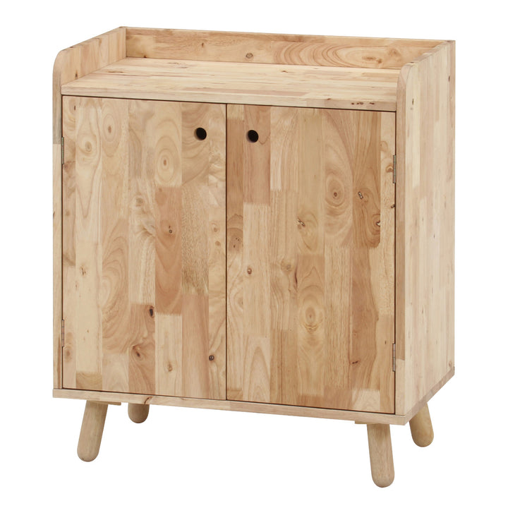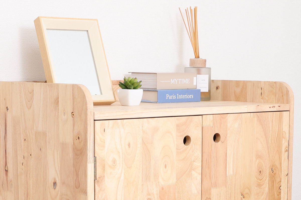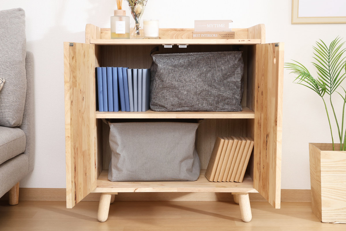 天然木の木目や節といった個性をそのまま活かしたデザインの扉付きキャビネットです。見せたくないものを、スッキリとした扉で隠して収納ができます。高さは80cmと、お子様でも使いやすい高さでお部屋を圧迫しません。