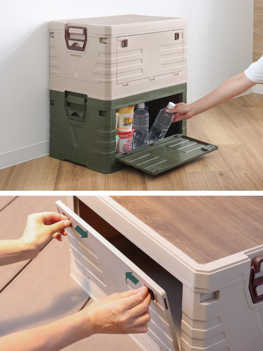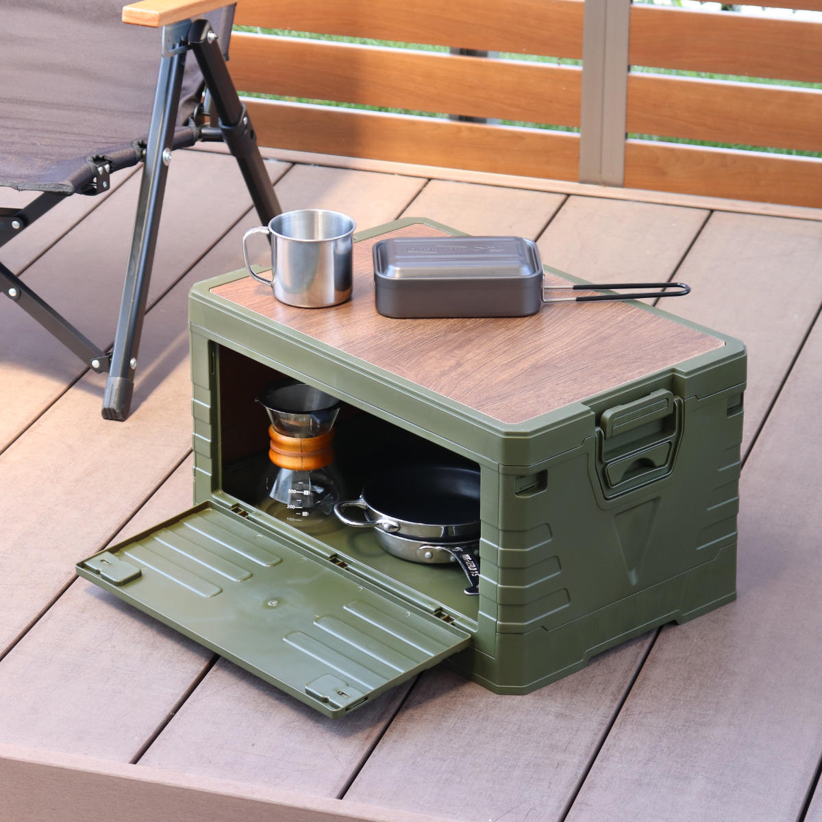 キャンプやバーベキューに活躍するコンテナボックスです。コンテナには大きく開く前ドアが付いていて、蓋の上に物を乗せたままでも中身がサッと取り出せます。調理器具や食器など必要なものをまとめて収納できます。