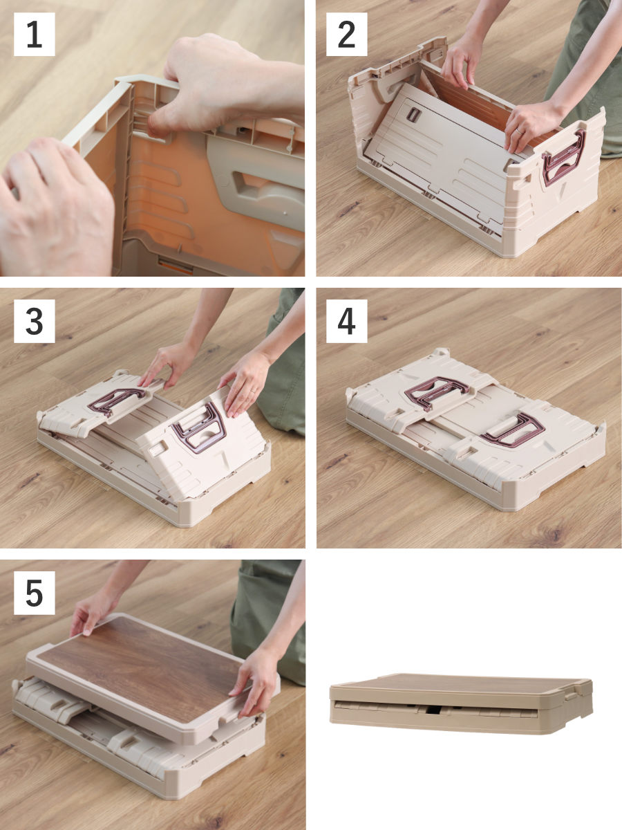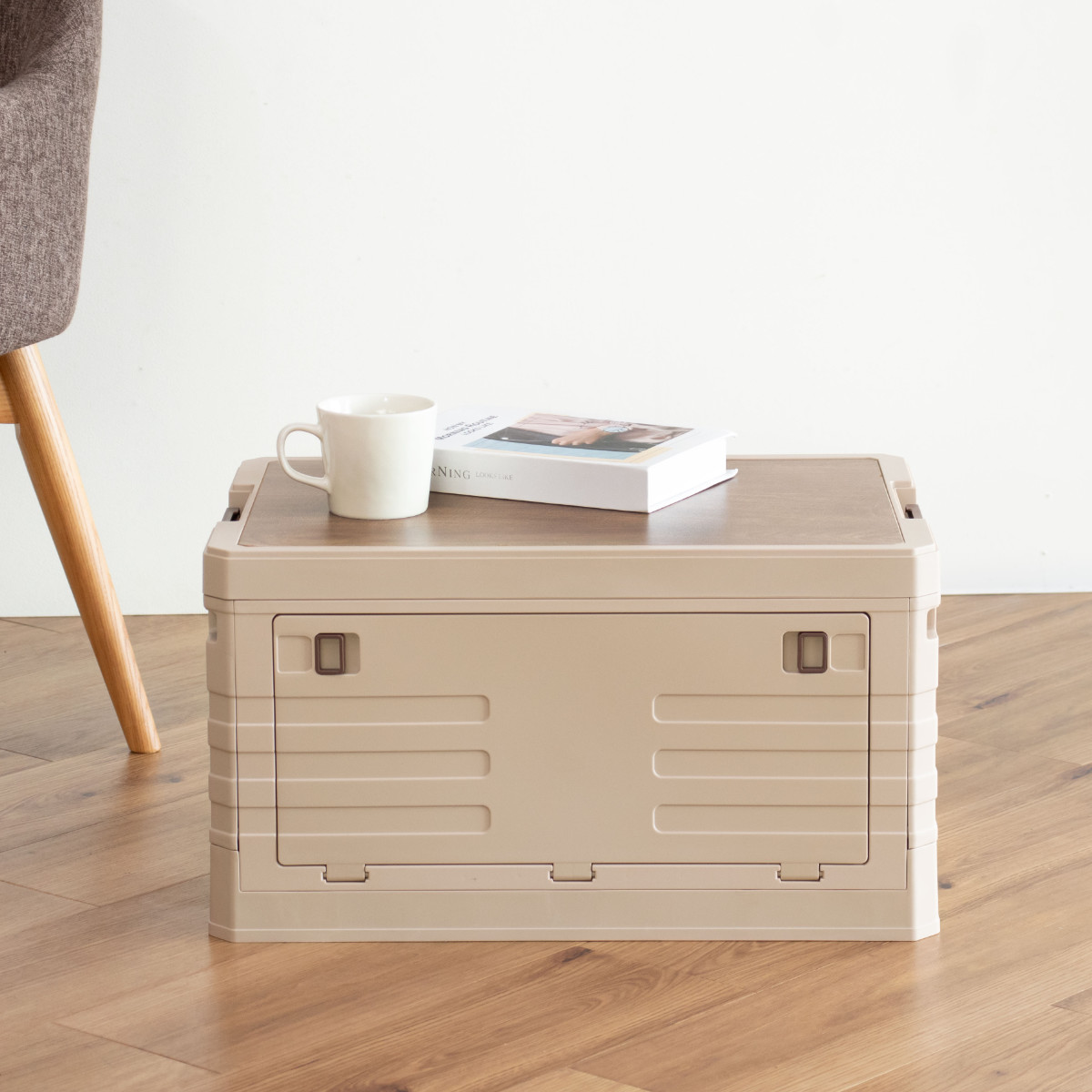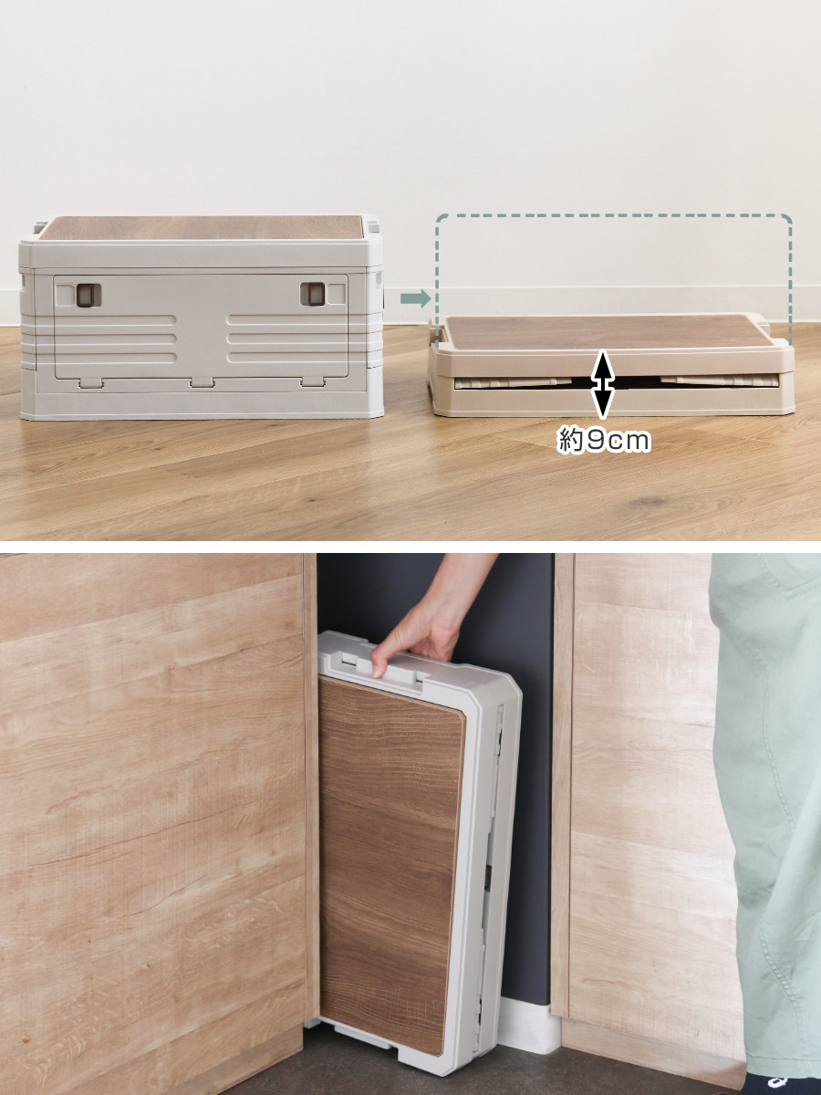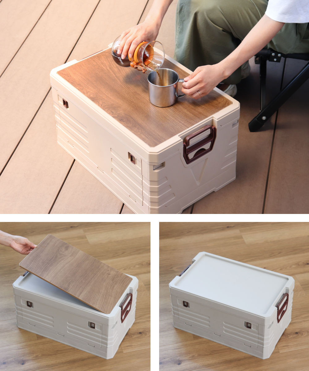 蓋には温かみの感じられる木目調の天板が付いています。アウトドアやレジャーシーンではテーブルとしてもお使いいただけます。また、天板は取り外しが可能です。