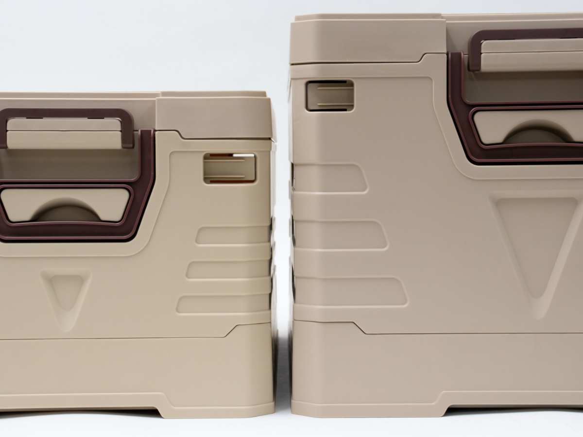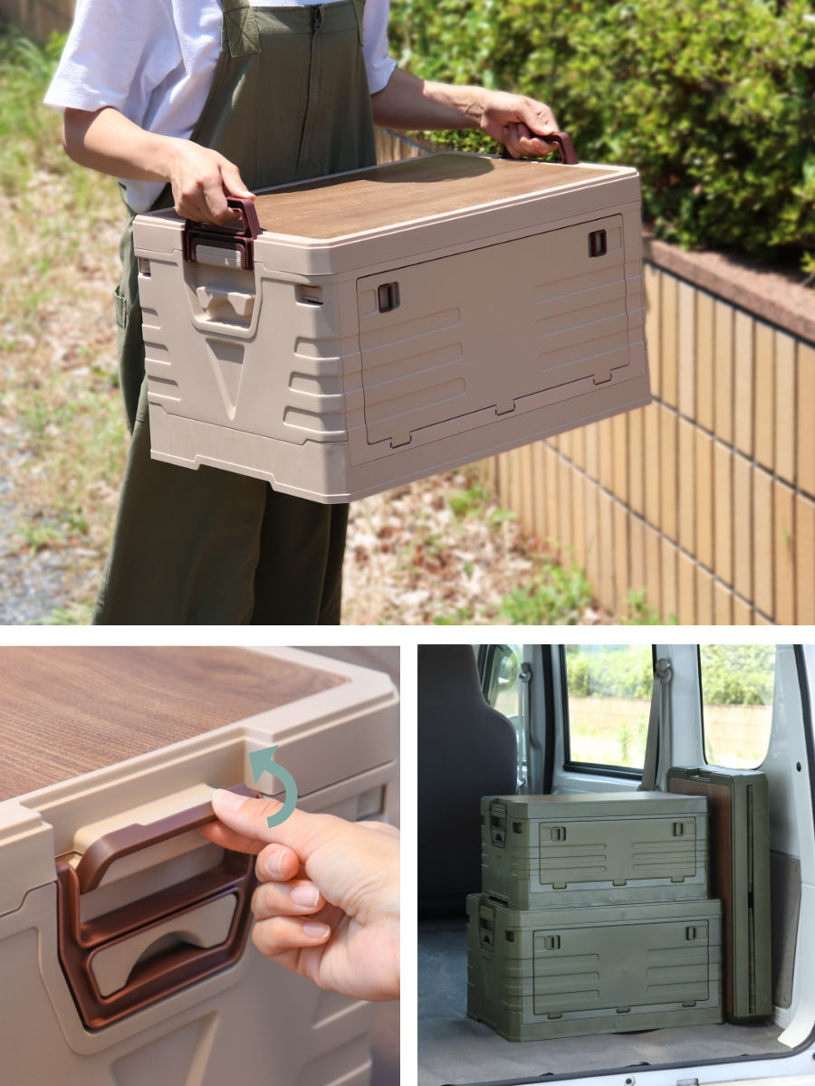 コンテナの両サイドには持ち運びに便利な取っ手が付いています。蓋と本体をしっかり固定できるロック付きで、移動時や積み重ね時も蓋が開いてしまう心配がなく、安心です。スタッキングできるので車の荷台にも積みやすく、使わないときはコンパクトにたためるので場所を取りません。
