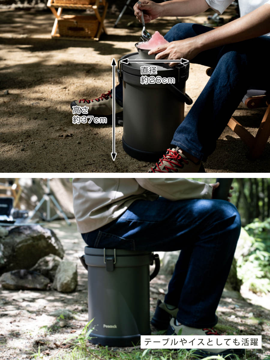 ステンレス製の本体は耐久性が高く、頑丈な設計です。蓋を閉めればテーブルや予備のイスとしてもお使いいただけます。フラットな蓋なので、飲み物や卓上の扇風機を置くことができます。