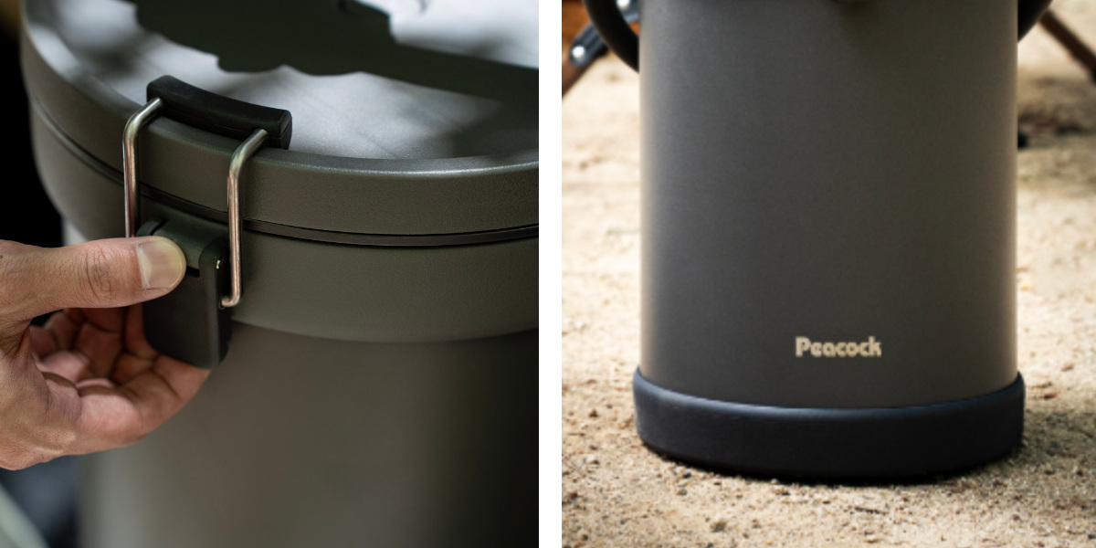 | 材質 | 胴部:ステンレス鋼(ポリエステル樹脂塗装) 内びん:ステンレス銅 ハンドル・底・中敷き・蓋:ポリプロピレン 底カバー:エラストマー 蓋パッキン:シリコーンゴム 蓋留め具:ポリプロピレン、ステンレス鋼 |