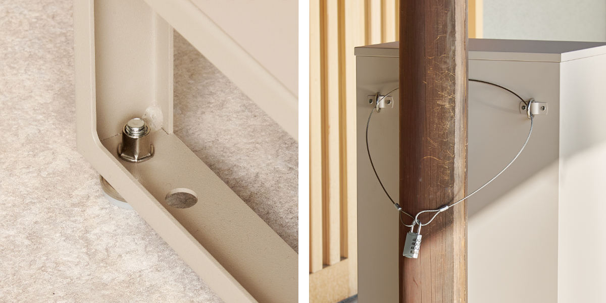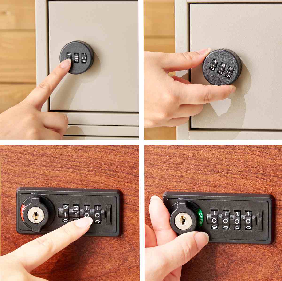 簡単操作のダイヤル錠付きで、簡単・安全に荷物を管理できます。事前に設定した任意のキーを入れ、ノブを右にひねると解錠できます。下段のダイヤル錠にはゼロリターン機能を搭載しており、解錠時に合わせた番号を自動で「0000」にリセットしてくれるので、ダイヤル番号の崩し忘れによる暗唱番号の漏洩を防止します。