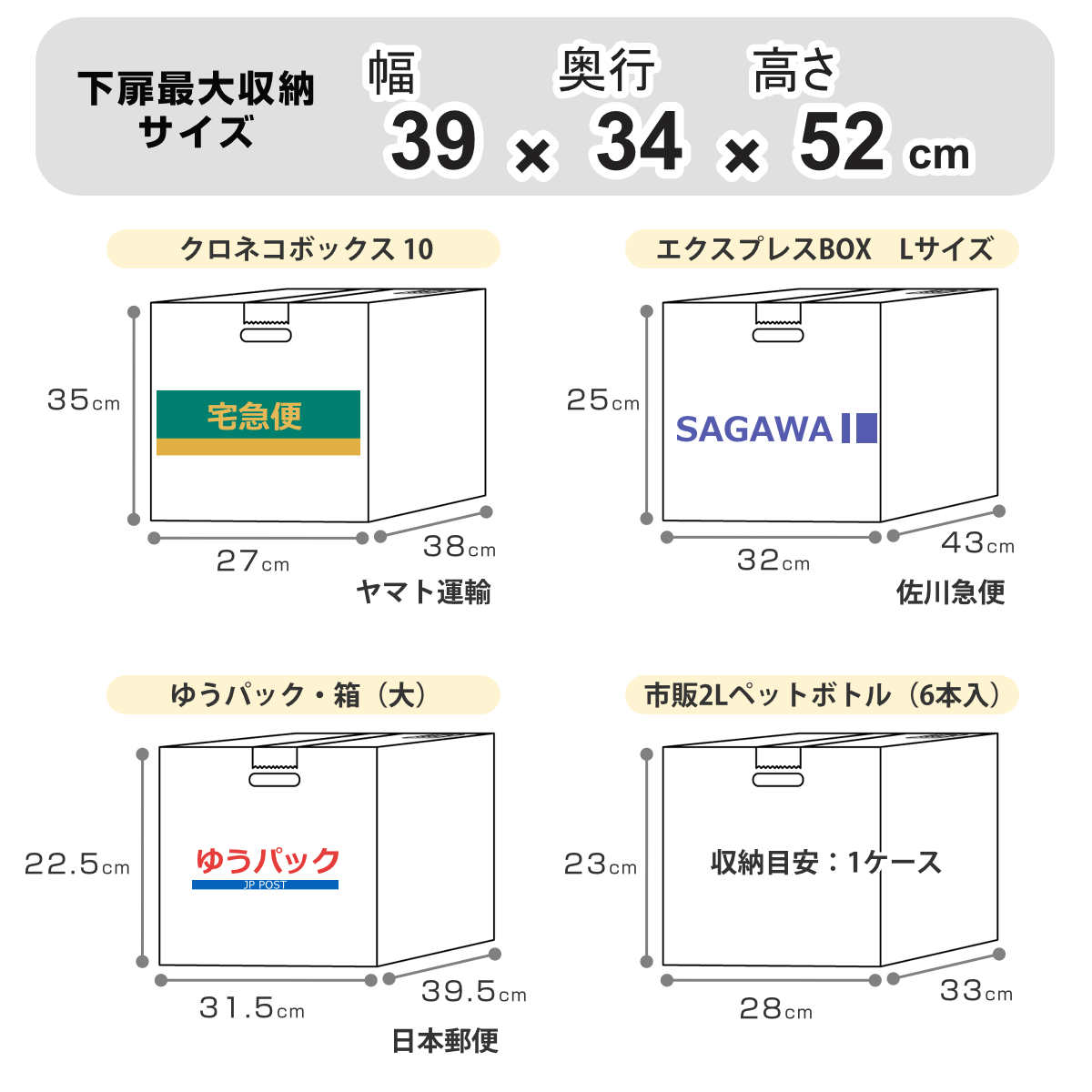 下段は最大約60Lの大容量を確保。まとめ買いしたペットボトルや重たいお米なども収納でき、定期購入品の受け取りにも便利です。