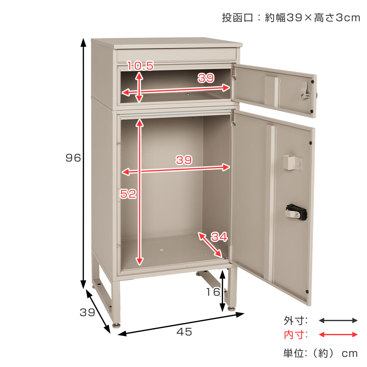 | サイズ | 約 幅45×奥行39×高さ96(cm) 投函口:約幅39×高さ3(cm) 下段:約幅39×高さ52(cm) |