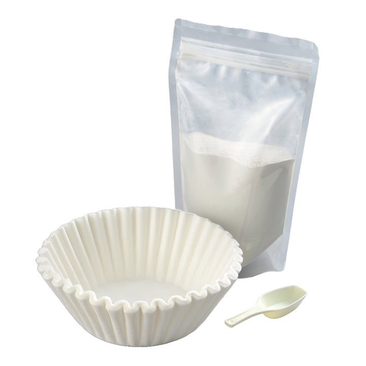 ろ過パウダー300g(約60回分)、フィルター60枚、計量スプーンのセットです。ろ過パウダーとフィルターは使用ごとに交換してください。