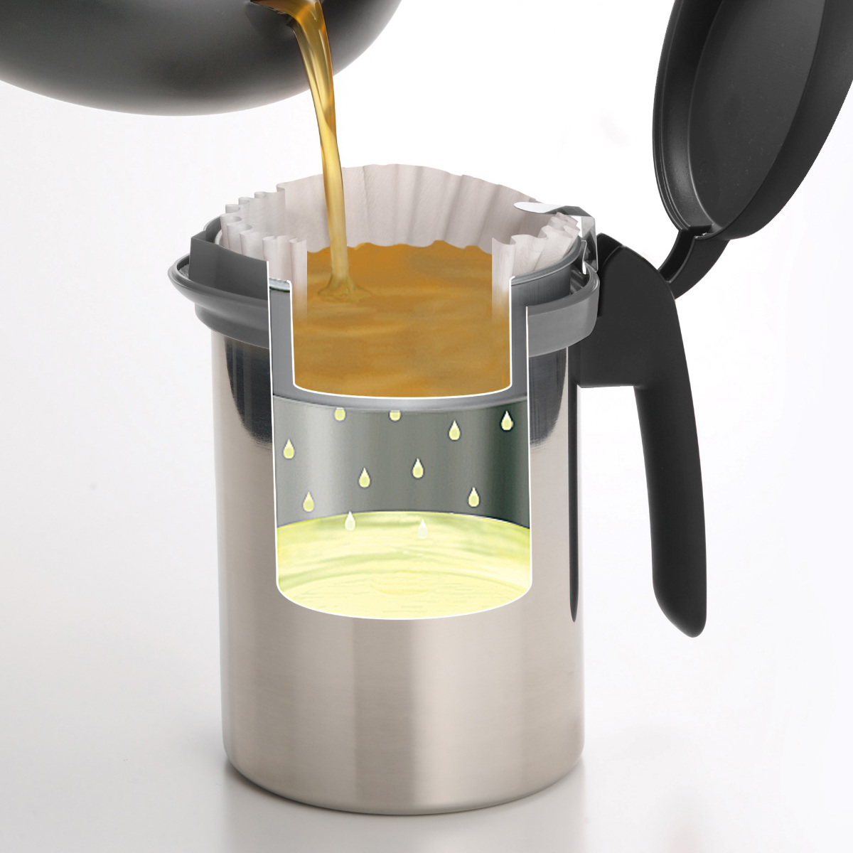 付属のろ過パウダーとフィルターの二重ろ過方式で不純物を除去し、いつもキレイな油で揚げ物ができます。油を使い回すことで油の購入回数が減り、家計の節約になります。