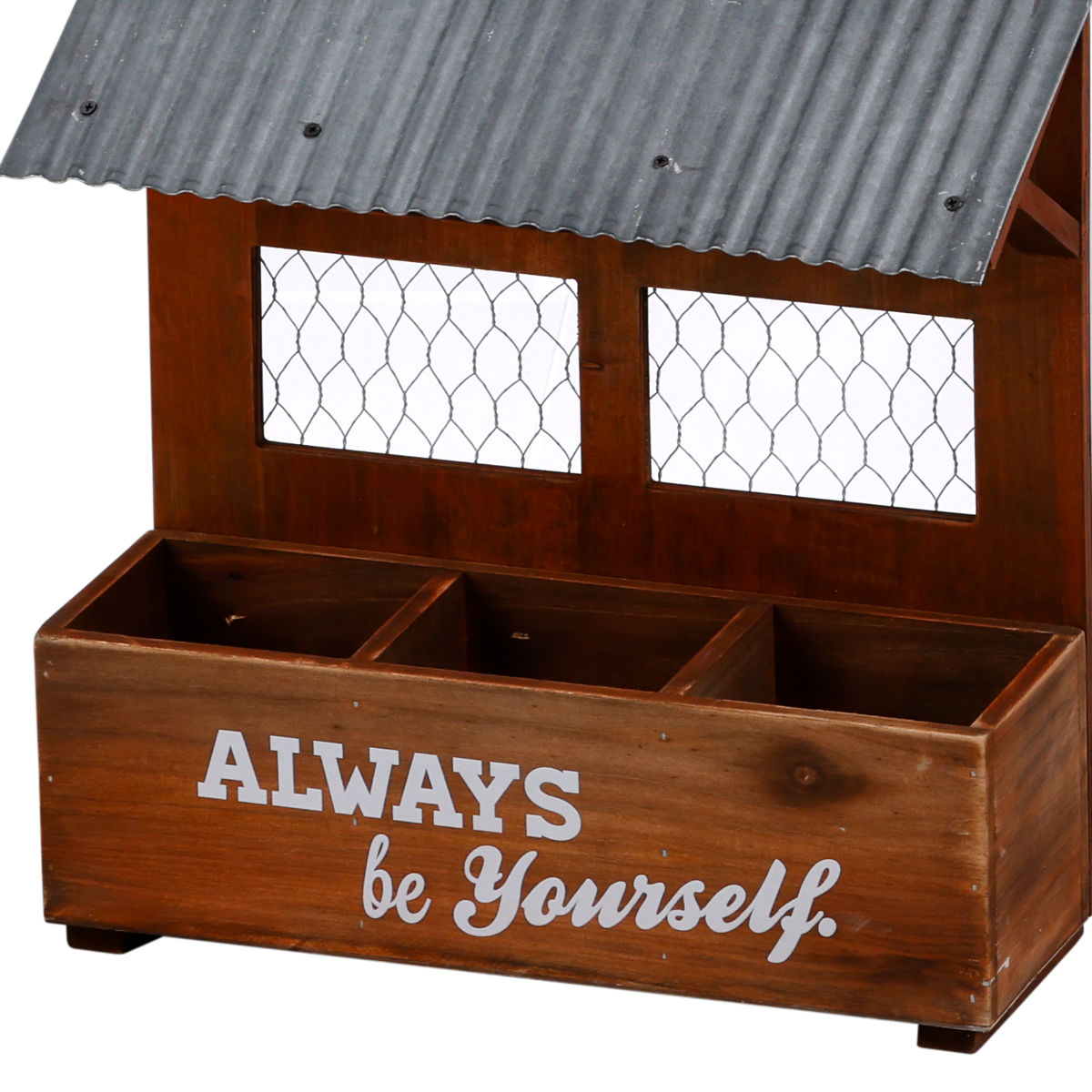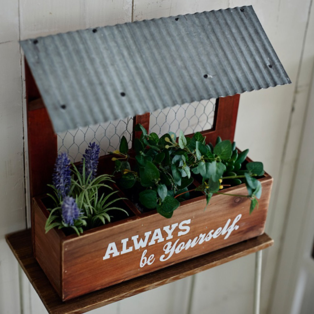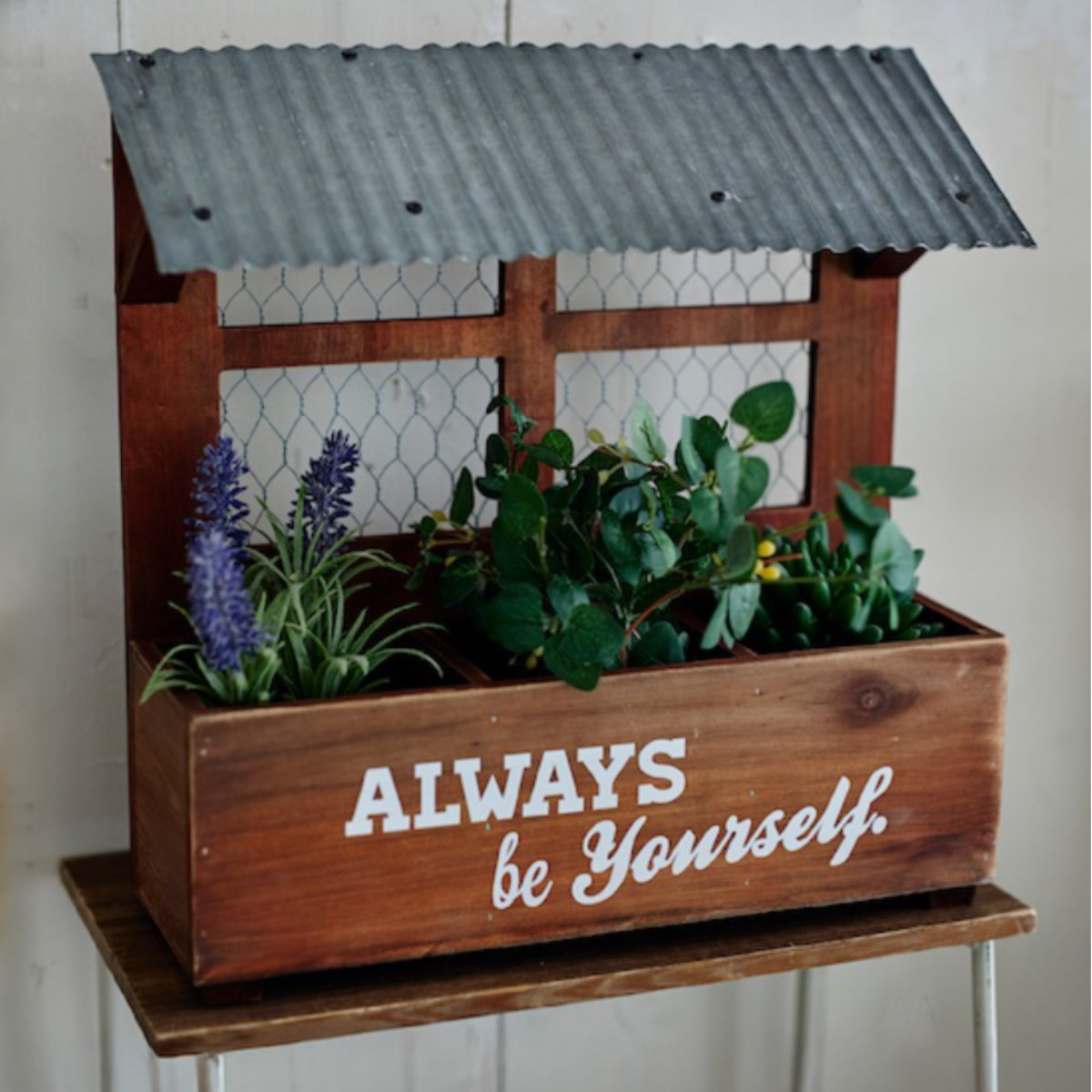 トタンとウッドの異素材の組み合わせがお洒落なガーデンインテリア「エコルフェ」シリーズです。シリーズで揃えて飾ると、お庭全体に統一感が生まれます。