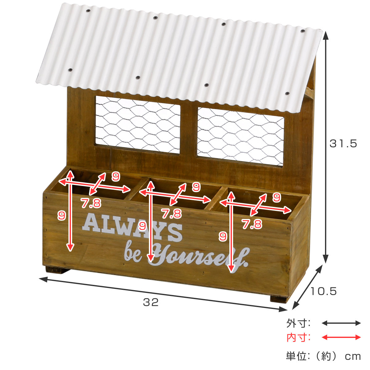 | 注意事項 | ※本製品は防水仕様ではありません。ジョーロや植木鉢等、水を直接注いでのご使用はお控え下さい。 ※ハンドメイドの為、サイズや色味などに個体差が生じます。 ※使い込まれた風合いを出す為に、わざとサビや、傷加工を施しています。 ※表面は塗りムラや、塗装が剥がれた部分、焼け跡に見える箇所がございます。 ※天然木のシミ・色ムラや塗装剥げ、プリントのかすれなどは、アンティーク加工によるものです。 ※使用環境により多少の歪み等が発生する場合がございます。 ※色移りするおそれがございますのでご注意ください。 |