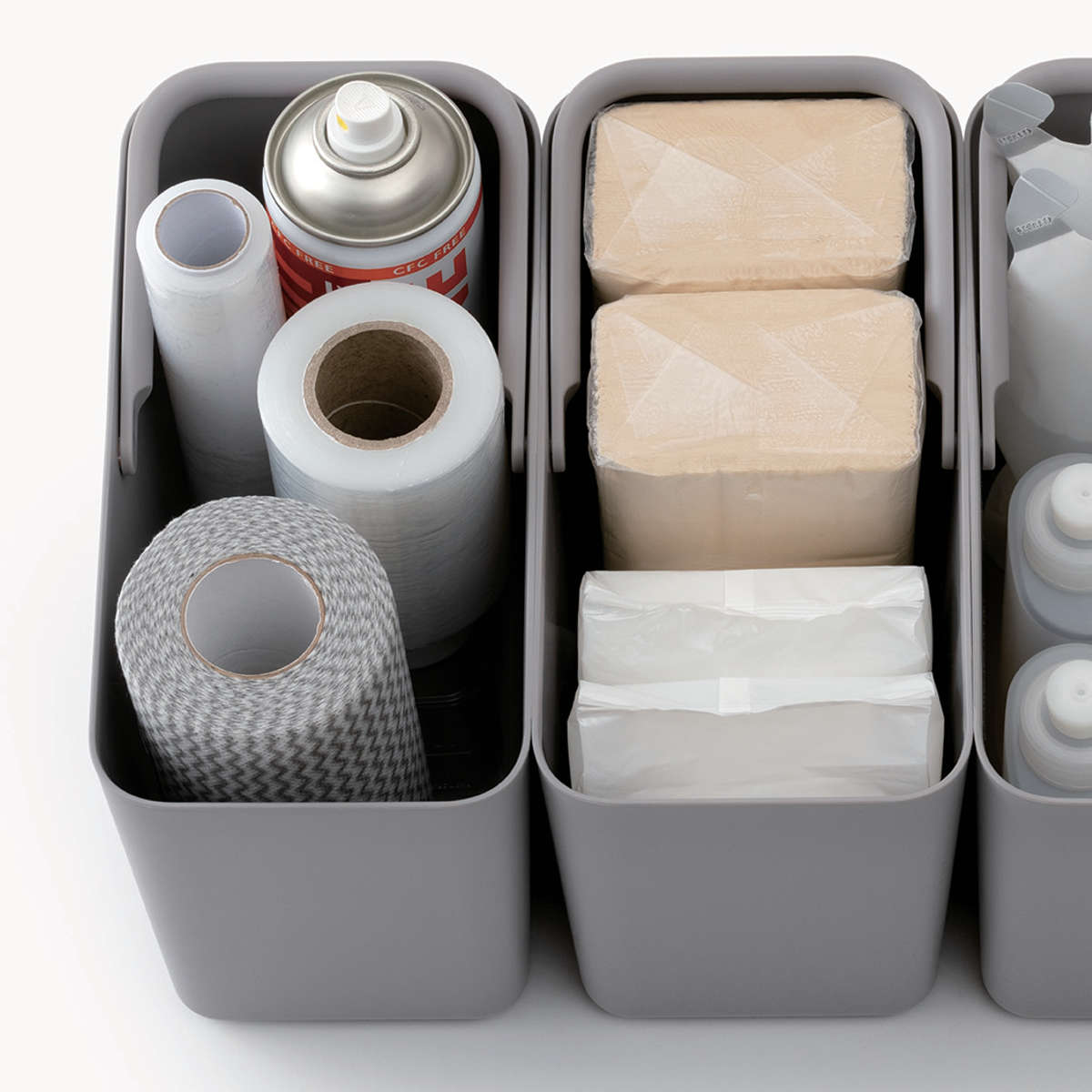 スリムタイプで場所を取らず狭い棚やすき間など、限られたスペースでも収納力を発揮します。食品のストックはもちろん、キッチン用品や掃除用品などの収納にも便利です。スリムタイプの容量は1個あたり約4.5Lです。