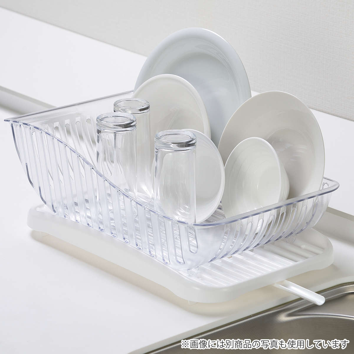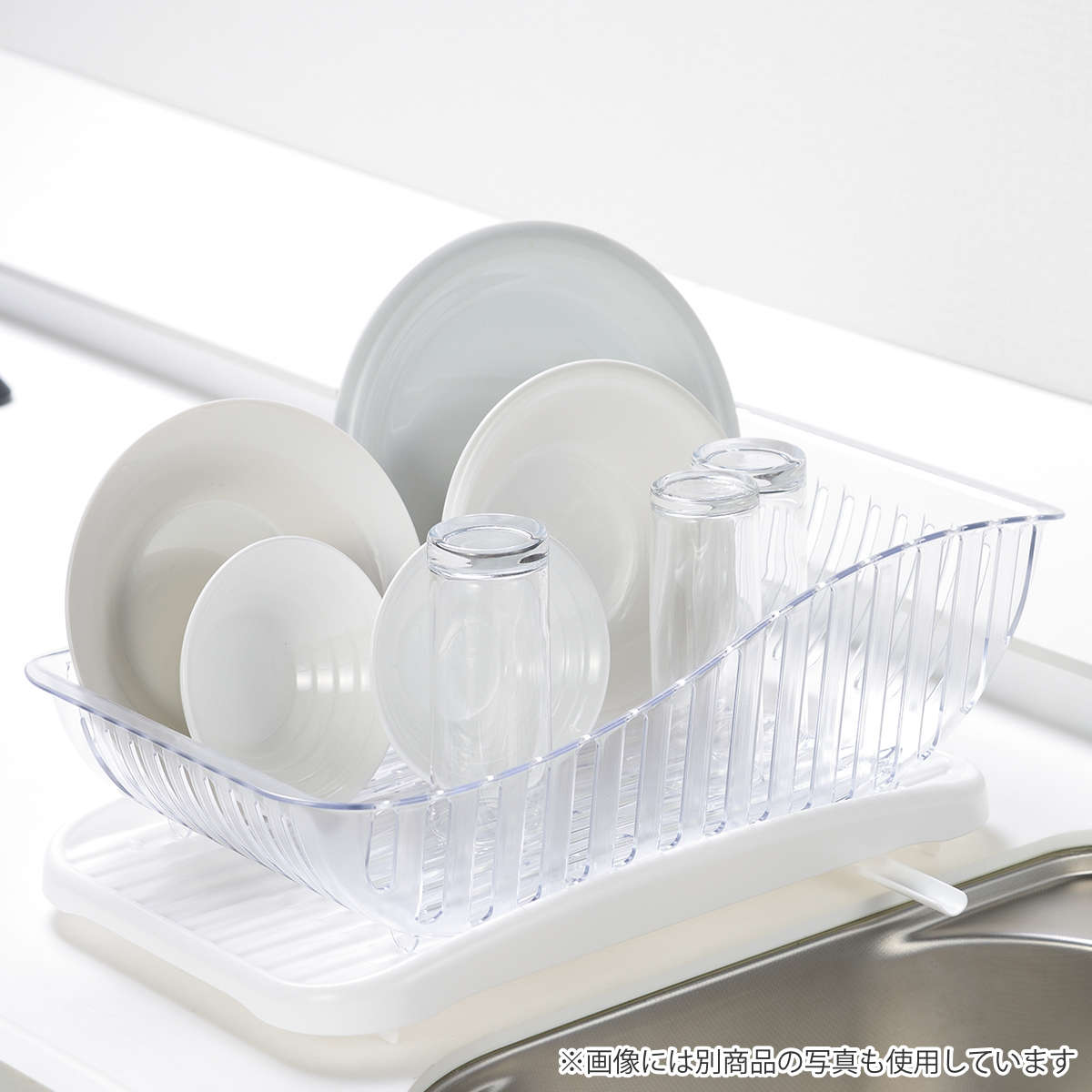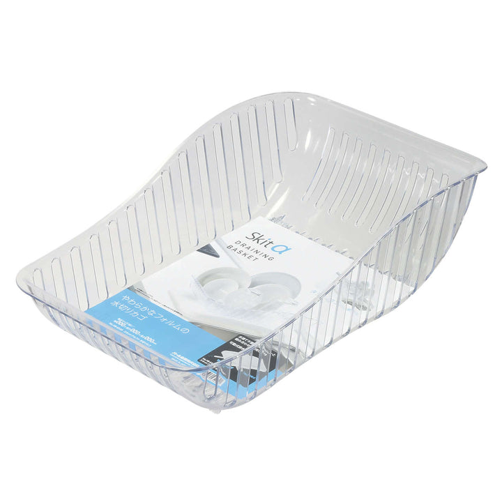 清潔感のあるクリアカラーと、流れるような美しいフォルムが魅力の水切りカゴです。別売の水切りトレーとの組み合わせはもちろん、お手持ちの珪藻土プレートや水切りマットともお使いいただけます。