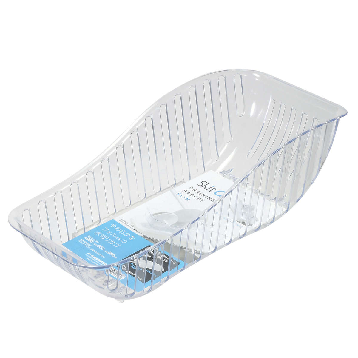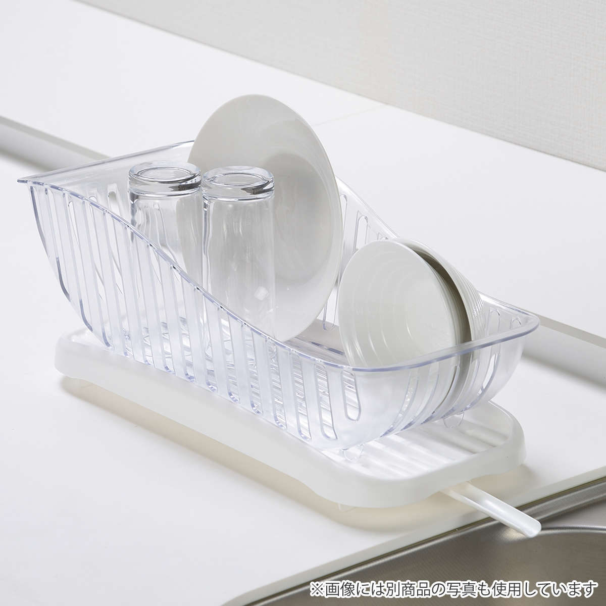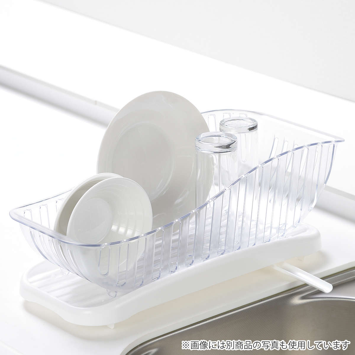 清潔感のあるクリアカラーと、流れるような美しいフォルムが魅力の水切りカゴです。別売の水切りトレーとの組み合わせはもちろん、お手持ちの珪藻土プレートや水切りマットとも相性よくお使いいただけます。