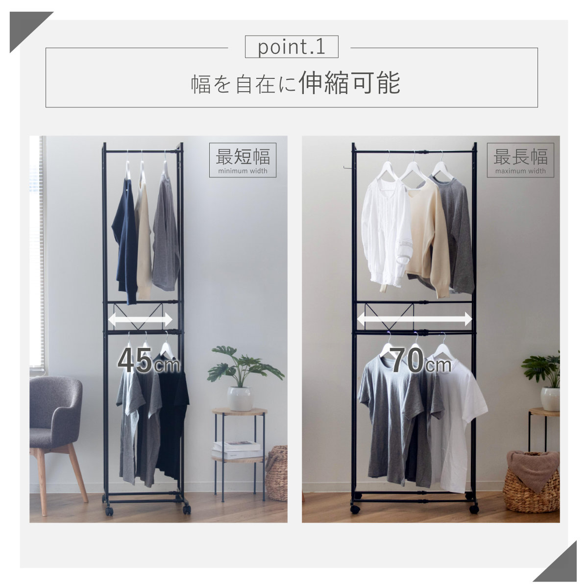 ハンガーラック 2段 ワイド 伸縮タイプ キャスター付き