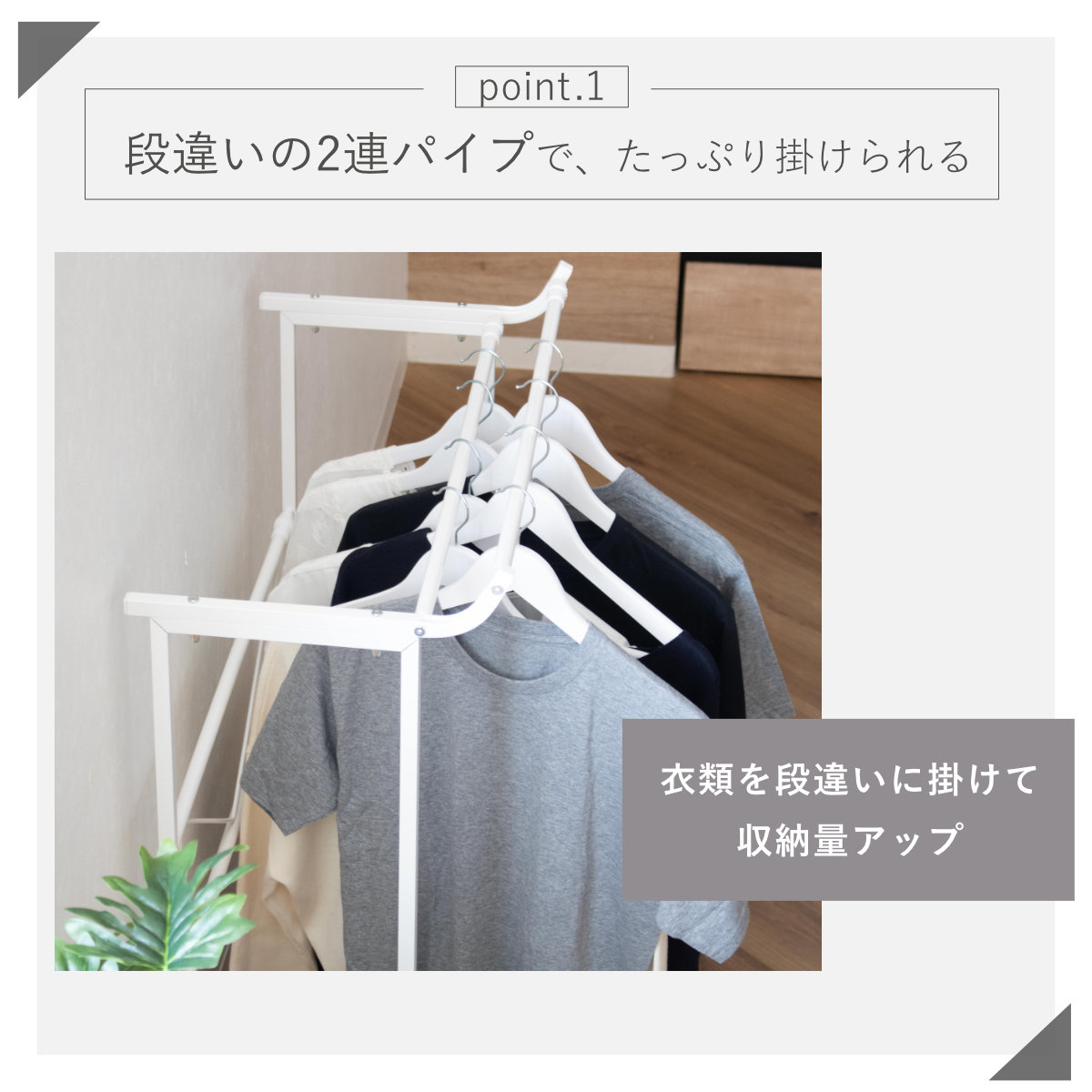2連パイプに衣類を段違いに掛けられるため、肩部分やハンガーの厚みが減り、収納量がアップします。パイプ1本あたり約10kgの耐荷重で、たっぷり収納できます。
