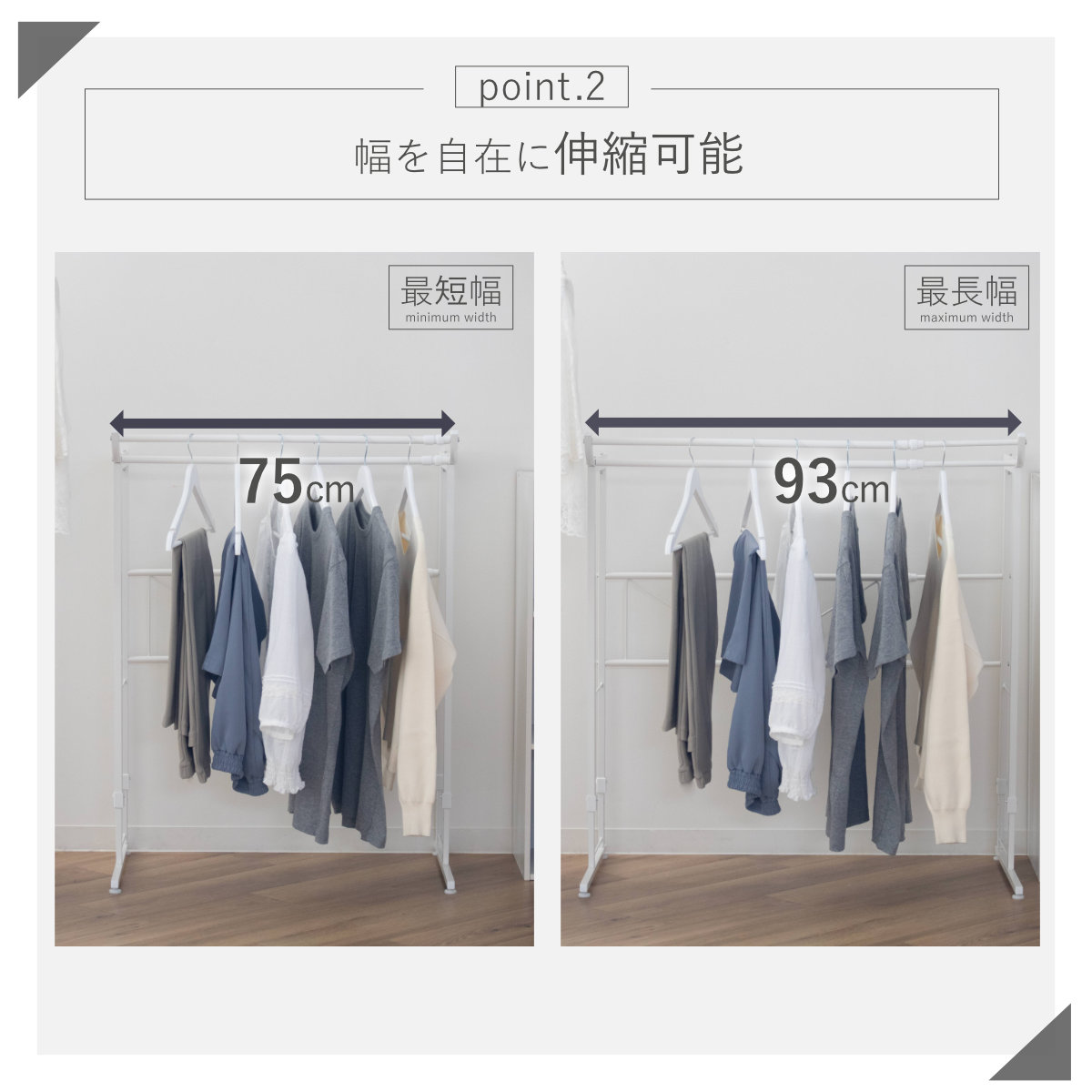 幅は最短75cmから最長93cmまで無段階で調節可能です。収納場所や収納量に合わせて最適なサイズで使用できます。