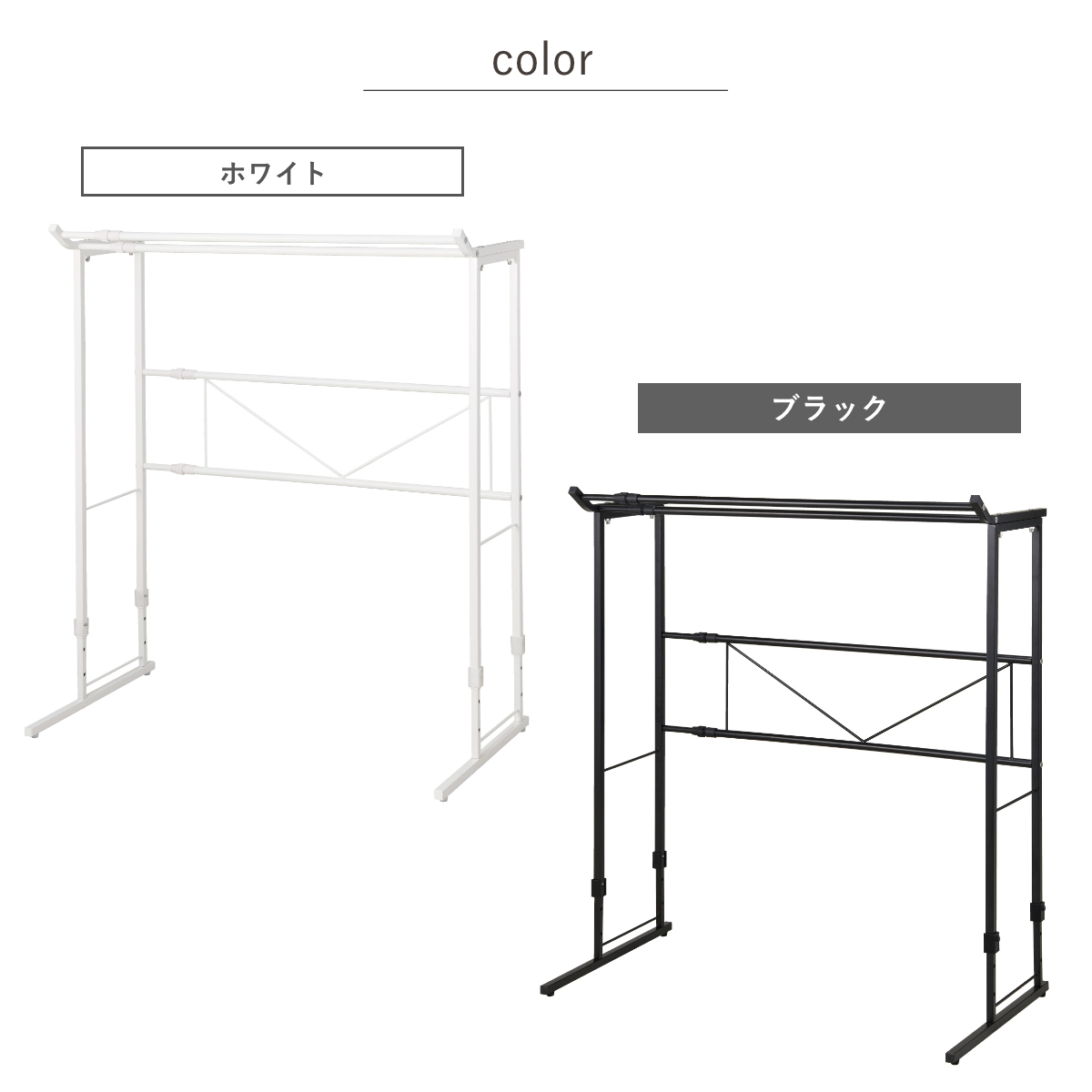| 材質 | サイドフレーム・高さ調節フレーム・上パイプ・ベースパイプ:スチール(エポキシ焼付塗装) 伸縮パイプ・背面パイプ:スチール(エポキシ焼付塗装)(樹脂部:ABS) 固定ピン:PE アジャスター:PP |