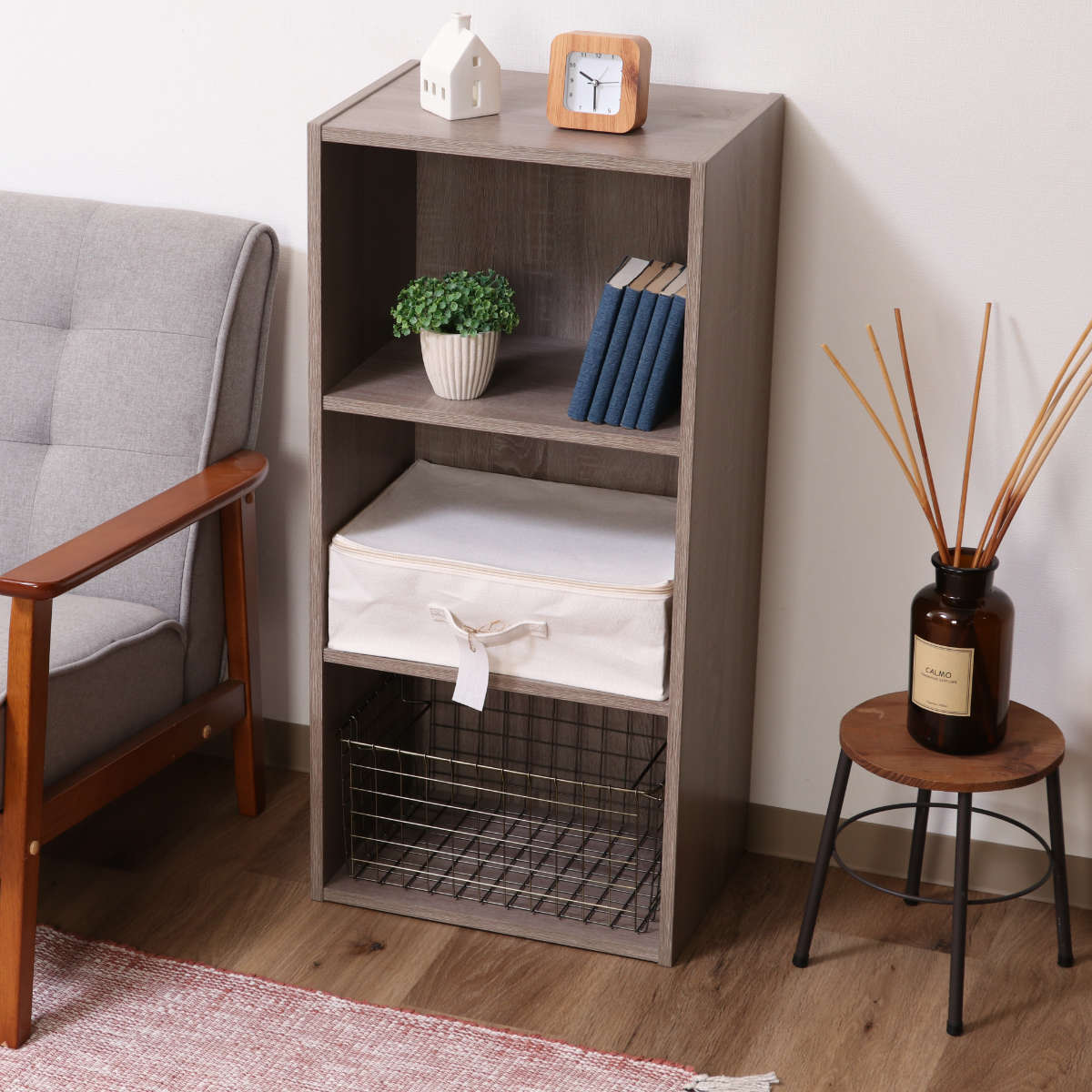 一般的なカラーボックスの幅にぴったり収まるサイズです。カラーボックス1段に2個入ります。