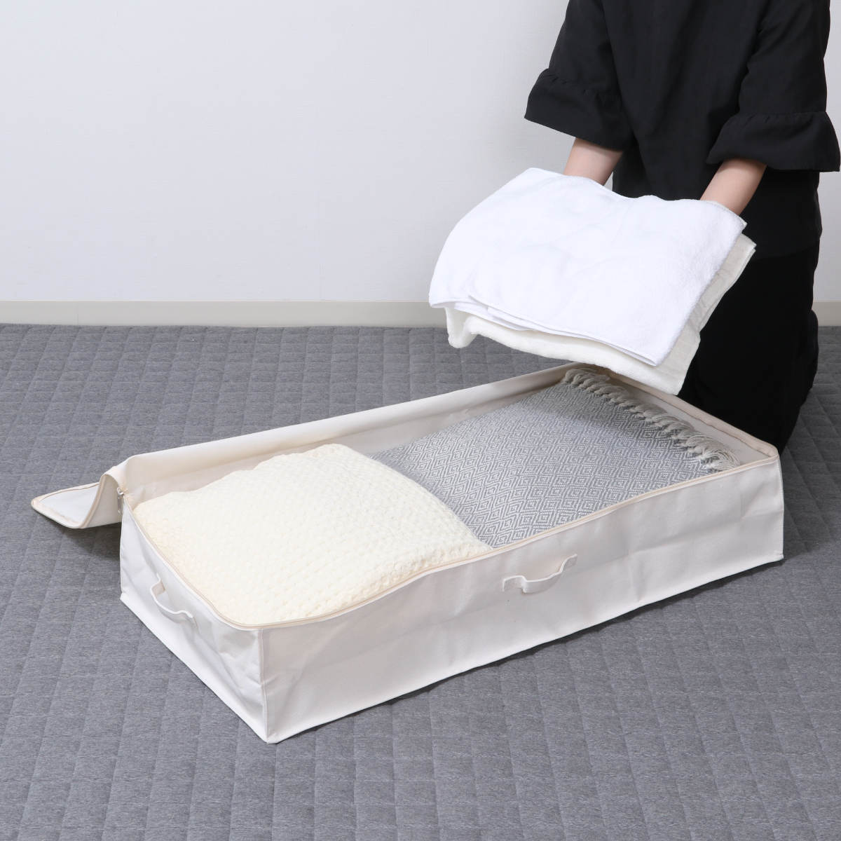 毛布なら1枚、厚手のセーターなら約10枚、薄手シャツなら約26枚入ります。季節ごとのかさばるアイテムをまとめて片付けられる、使い勝手抜群のサイズです。