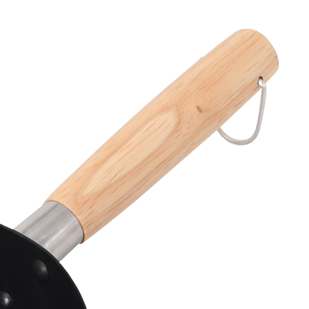 天然木製のハンドルは熱が伝わりにくく、長時間の調理でも扱いやすい素材です。ハンドル先端にリングが付いており、フックに掛けて壁収納できます。