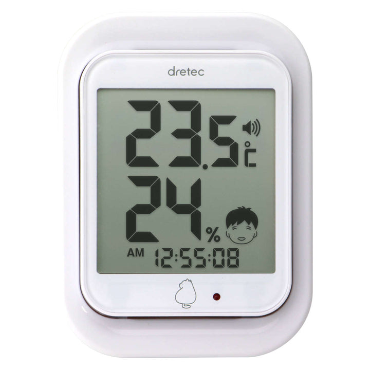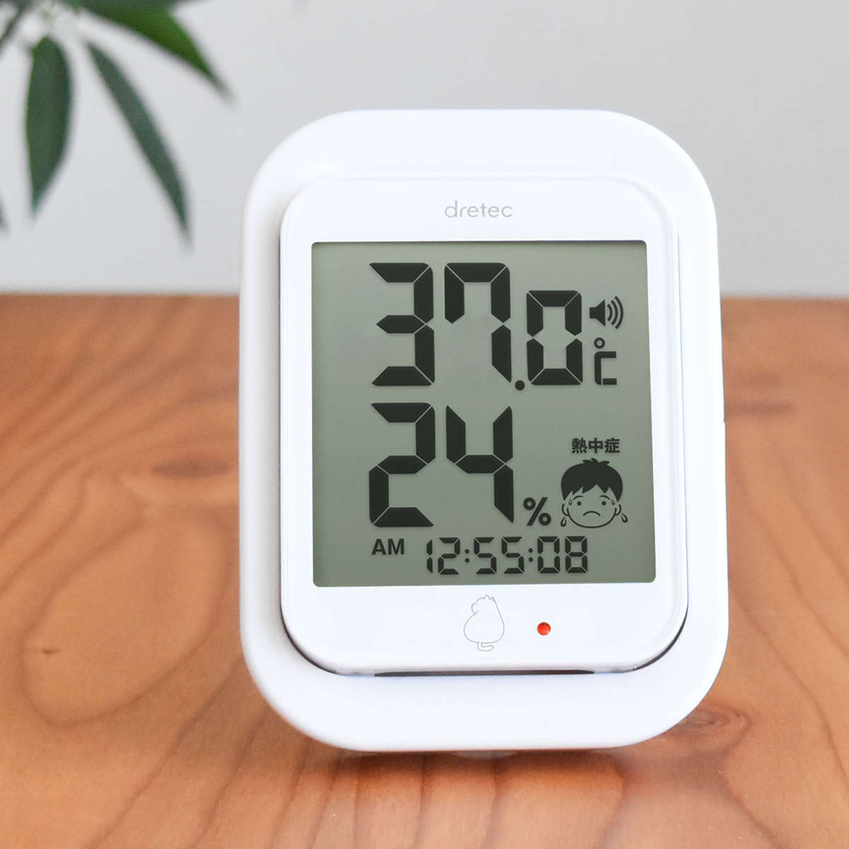 置き場所を選ばず使える、無駄のないシンプルなデザインの温湿度計です。熱中症の危険度を表情アイコン・アラーム音・ランプでわかりやすく知らせてくれ、快適な室内環境づくりをサポートします。