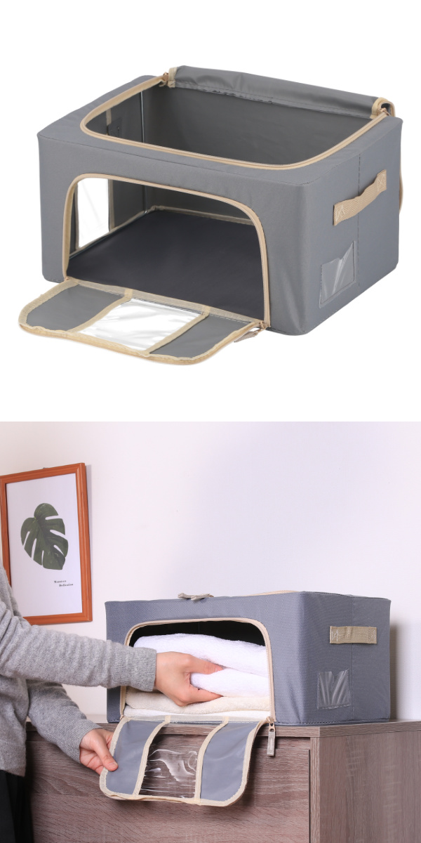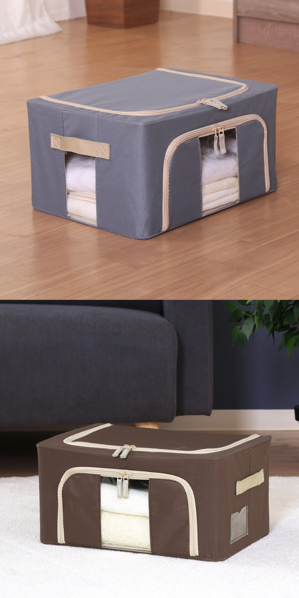 スチール製フレーム入りなので、型崩れしにくく収納物をしっかり支えます。安定感があり積み重ねても安心です。積み重ねることで、限られた場所でも縦のスペースを有効活用できます。