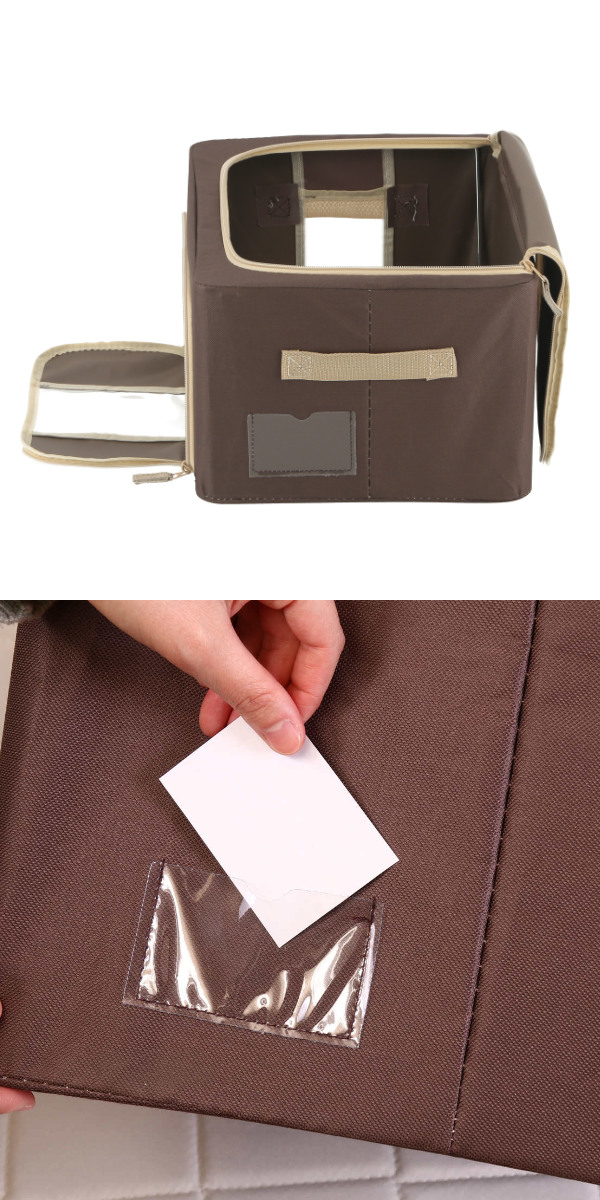 ネームタグを差し込めるポケットが側面にあり、収納物の管理がしやすく整理整頓に役立ちます。