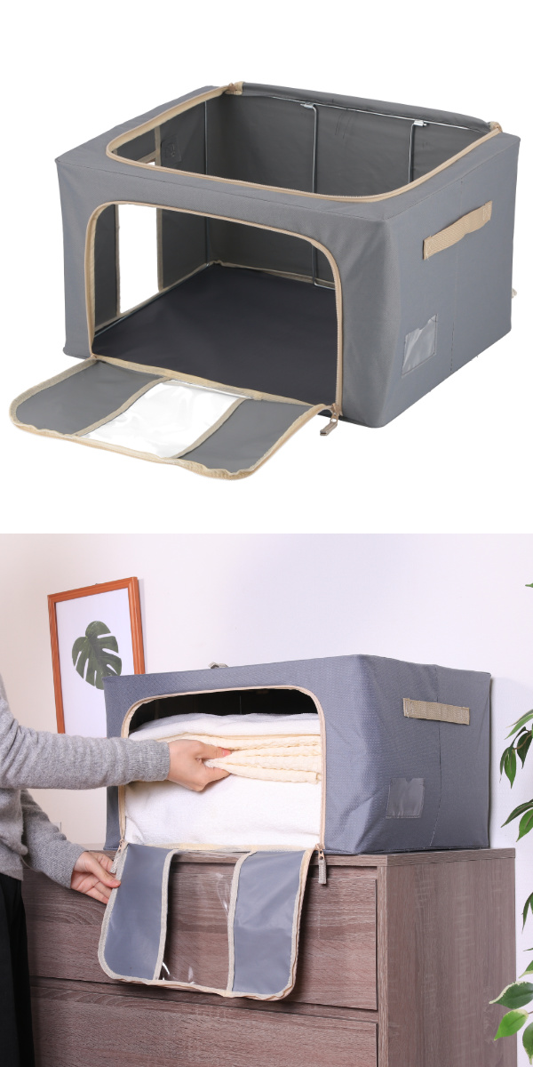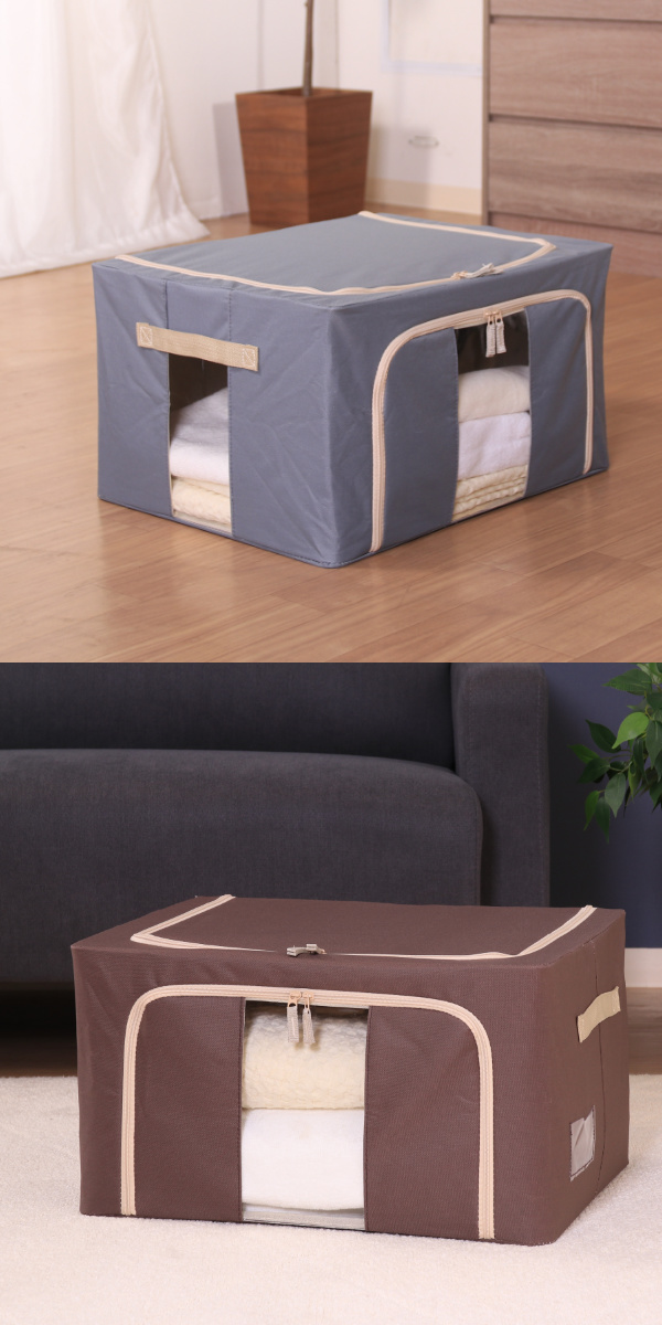 スチール製フレーム入りなので、型崩れしにくく収納物をしっかり支えます。安定感があり積み重ねても安心です。積み重ねることで、限られた場所でも縦のスペースを有効活用できます。