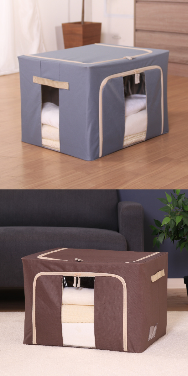 スチール製フレーム入りなので、型崩れしにくく収納物をしっかり支えます。安定感があり積み重ねても安心です。積み重ねることで、限られた場所でも縦のスペースを有効活用できます。