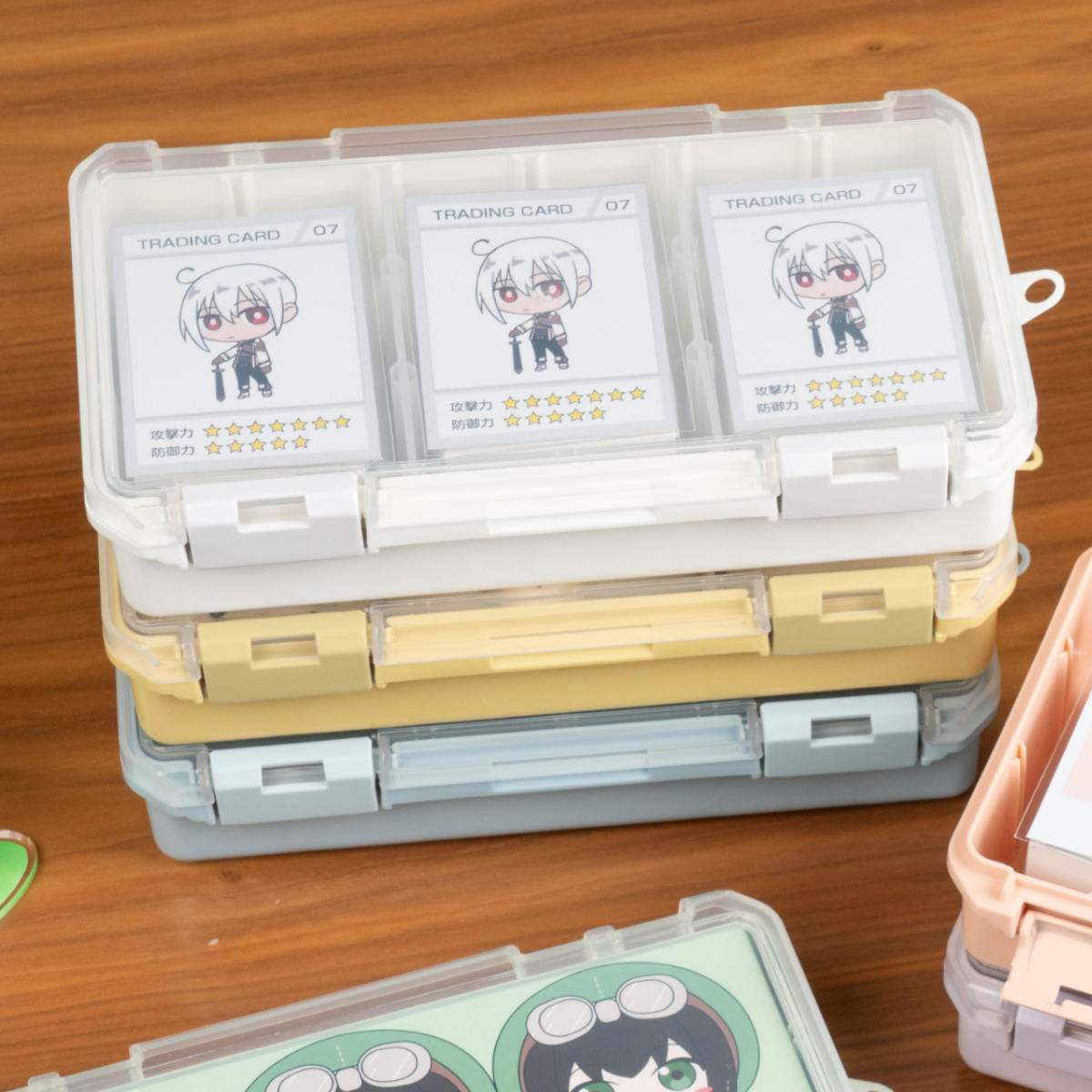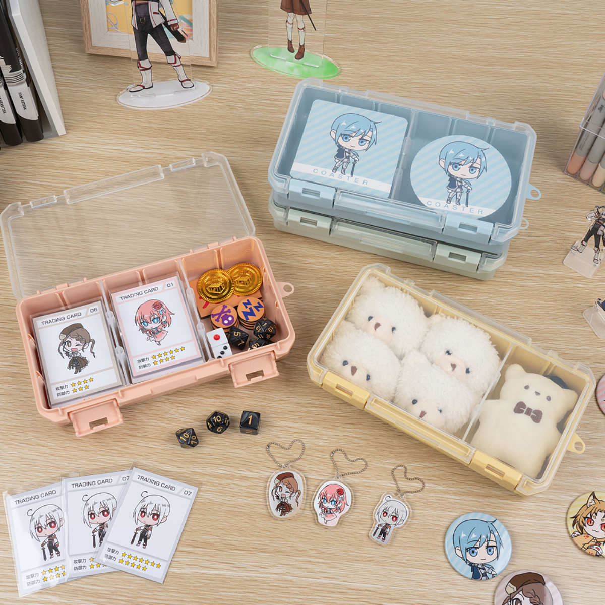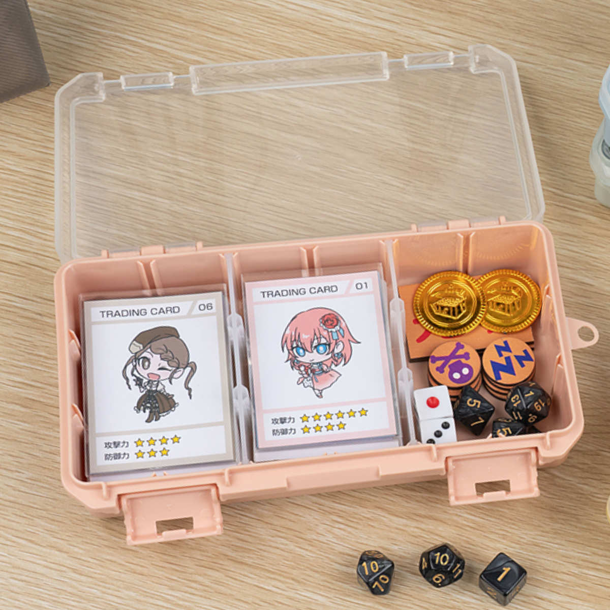 仕切板を使用すると、トレーディングカードがぴったりフィットします。トレーディングカードとダイスなどの小物を一緒に収納できます。